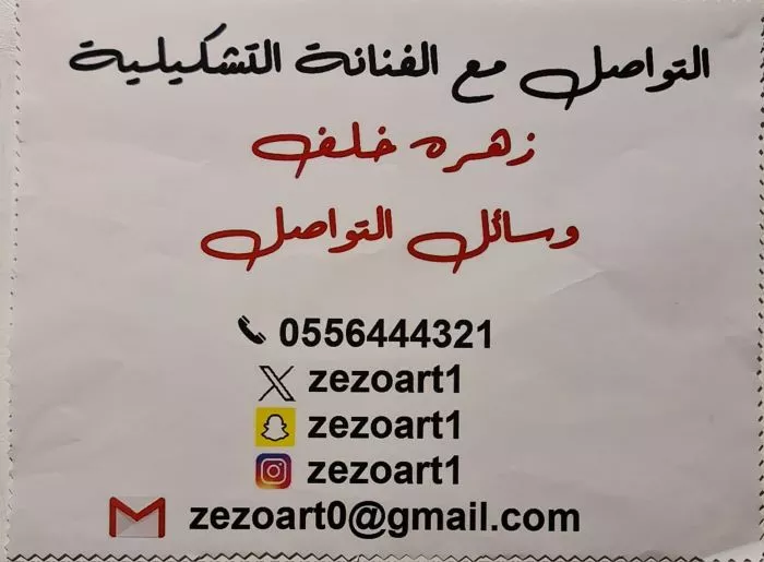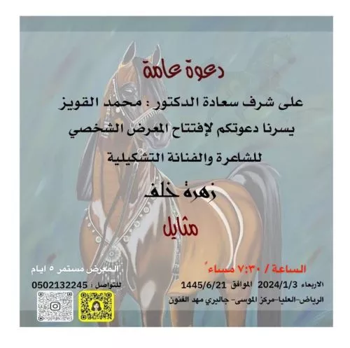 ولمدة خمسة ايام الساعة ٣٠ : ٧ مساءدعوة عامةعلى شرف سعادة الدكتور : محمد القويز يسرنا دعوتكم لأفتتاح المعرض الشخصي للشاعرة والفنانة التشكيليةزهرة خلف