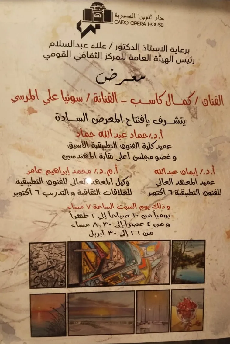 دار الأوبرا المصرية CAIRO OPERA HOUSE قاعة صلاح طاهر برعاية الاستاذ الدكتور / علاء عبد السلام رئيس الهيئة العامة للمركز الثقافي القومي معرض الفنان / كمال كاسب - الفنانة / سونيا علي المرسي - يتشرف بإفتتاح المعرض السادة أ.د. حماد عبد الله حماد عميد كلية الفنون التطبيقية الاسبق و عضو مجلس أعلى نقابة المهندسين أ.د. إيمان عبد الله عميد المعهد العالي لفنون التطبيقية ٦ اكتوبر أ.م.د. محمد إبراهيم عامر وكيل المعهد العالي للفنون التطبيقية للعلاقات الثقافية والتدريب ٦ اكتوبر