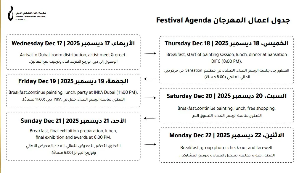 الأربعاء ١٧ ديسمبر ٢٠٢٥ الوصول إلى دبي، الغرفة توزيع، لقاء وتحية للفنانين. الخميس ١٨ ديسمبر إفطار، بدء جلسة الرسم، غداء، عشاء في سانسيشن مركز دبي المالي العالمي (٨:٠٠ مساءً). الجمعة، ١٩ ديسمبر إفطار، مواصلة الرسم، غداء، حفل في إنكا دبي (١١:٠٠ مساءً).