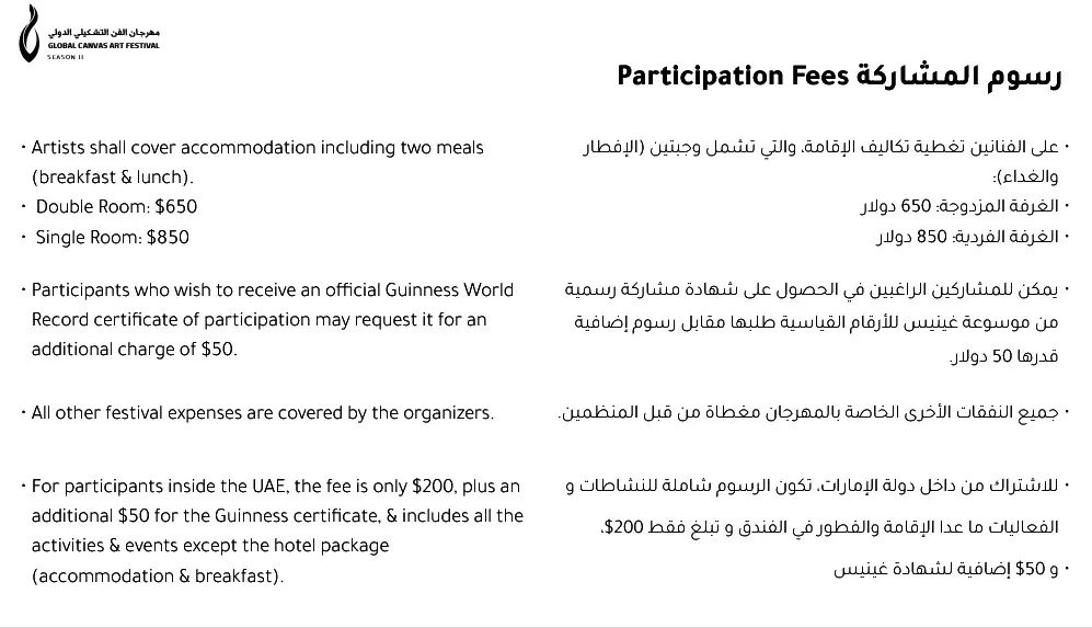 للمشاركين من داخل دولة الإمارات العربية المتحدة، تبلغ الرسوم 200 دولار أمريكي فقط، بالإضافة إلى 50 دولارًا أمريكيًا إضافية لشهادة غينيس، وتشمل جميع الأنشطة والفعاليات باستثناء باقة الفندق (الإقامة والإفطار).