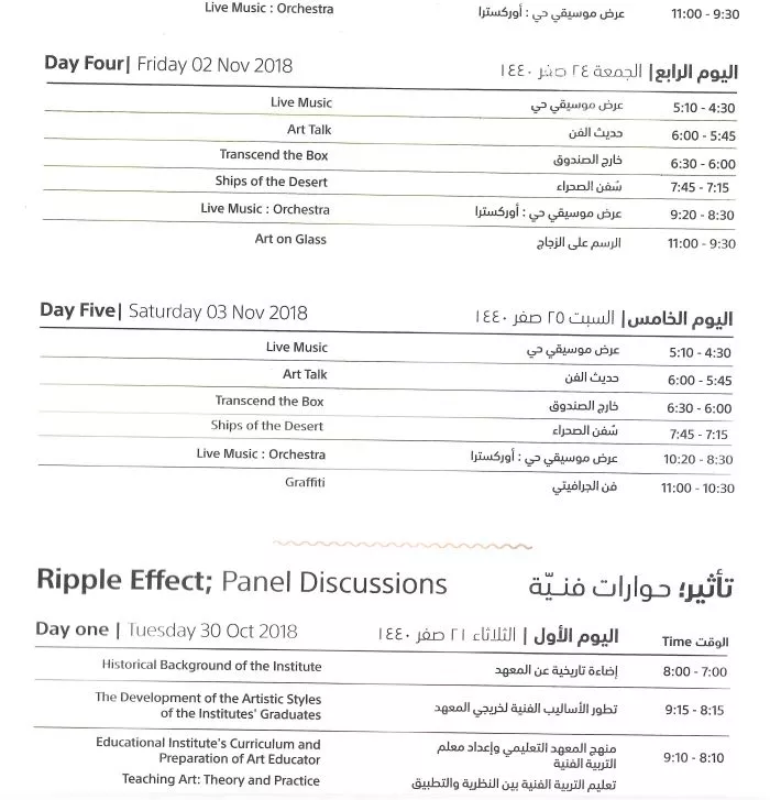 تستهل الرحلة برفقة رواد الفن السعودي ممن مهدوا الطريق للفن في المملكة العربية السعودية من خلال الممارسين الحاليين الذين يبحثون في الفنون والتصميم وتأثيرهم في وجه الحوار الإبداعي ليعيدوا تعريفه في المنطقة بهدف إيصاله إلى جيل المستقبل الذي سيواصل بفكره ناهضا بالمساعي الإبداعية. سيستمتع زوار مسك الفنون ۲۰۱۸ بخوض تجربة فريدة في فضاءات متنوعة من الفنون، تبدأ من التصوير والنحت وحضور معارض للفن الحديث والمعاصر ممتدة إلى فنون الموسيقى الكلاسيكية والشعبية، ومن الشارع والفن التركيبي والاستعراضات الفنية المختلفة. كما يحتوي المهرجان على مجموعة واسعة من ورش العمل والحوارات وحلقات النقاش.