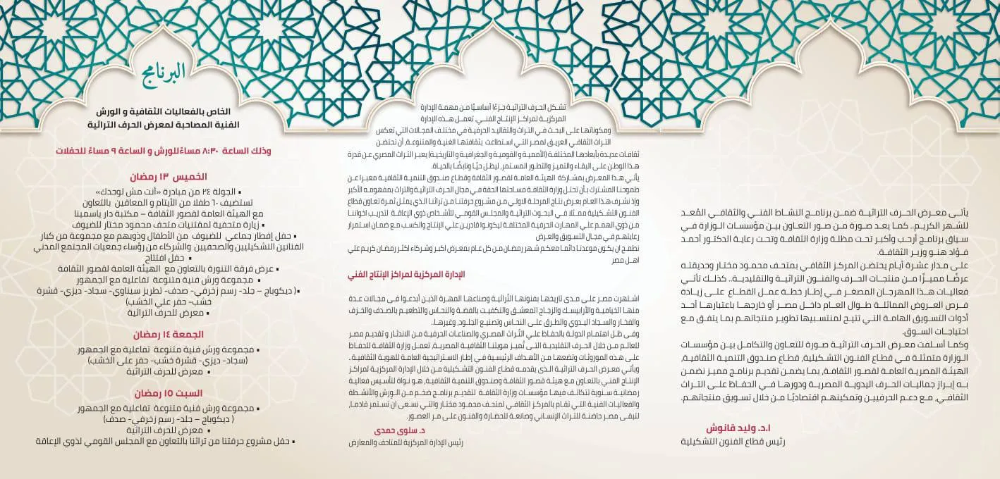 في أمسية رمضانية رائعة تم افتتاح معرض "الحرف التراثية" بمركز محمود مختار الثقافي بحضور د/ سلوى حمدي رئيس الإدارة المركزية للمتاحف والمعارض وبرفقتها الفنان/ أحمد الشافعي ونخبة من الفنانين تم افتتاح معرض "الحرف التراثية" يوم الخميس 13 مارس 2025 بمركز محمود مختار الثقافي Mahmoud Mokhtar Cultural Center . يصاحب المعرض إقامة مجموعة من الفعاليات الثقافية والورش الفنية خلال شهر رمضان المبارك وذلك بالتعاون مع المجلس القومي لذوي الإعاقة، الهيئة العامة لقصور الثقافة، قطاع صندوق التنمية الثقافية. تستمر الفعاليات والورش حتى 23 مارس 2025. لا تفوتوا فرصة الحضور والاستمتاع (الدخول مجاناً). الورش من الساعة 8.30 مساء. الحفلات من الساعة 9 مساء. دايما سعداء بوجدكم. #قطاع_الفنون_التشكيلية #معارض_فنية