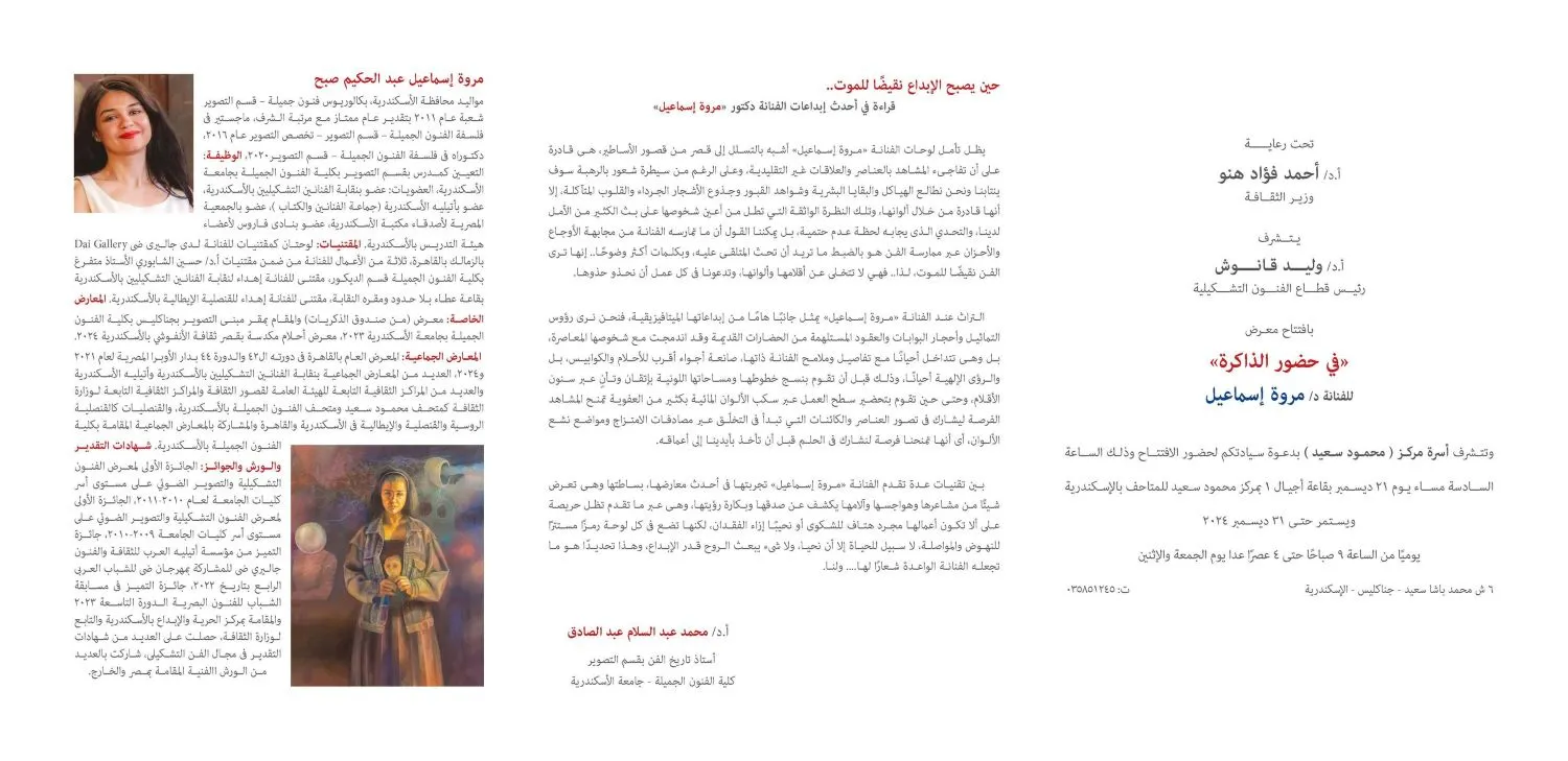 تم افتتاح معرض "فى حضور الذاكرة" للفنانة/ مروة إسماعيل بقاعة أجيال (1) مركز محمود سعيد للمتاحف بالإسكندرية Mahmoud Said Museums Center مركز محمود سعيد للمتاحف بحضور المهندس / حسن وصفى نقيب نقابة الفنانين التشكيليين بالإسكندرية سابقا، الدكتور / مصطفى عيسى، الفنانة التشكيلية/ فاطمة الزهراء مدير مركز محمود سعيد للمتاحف سابقا، الدكتور / محمد عبدالسلام استاذ التاريخ بكلية الفنون الجميلة الاسكندرية ونخبة من الفنانين التشكيليين، يوم السبت 21/12/2024 بقاعة أجيال (2) بمركز محمود سعيد للمتاحف بالإسكندرية. المعرض مستمر 31/12/2024. يسعدنا زيارتكم. #قطاع_الفنون_التشكيلية