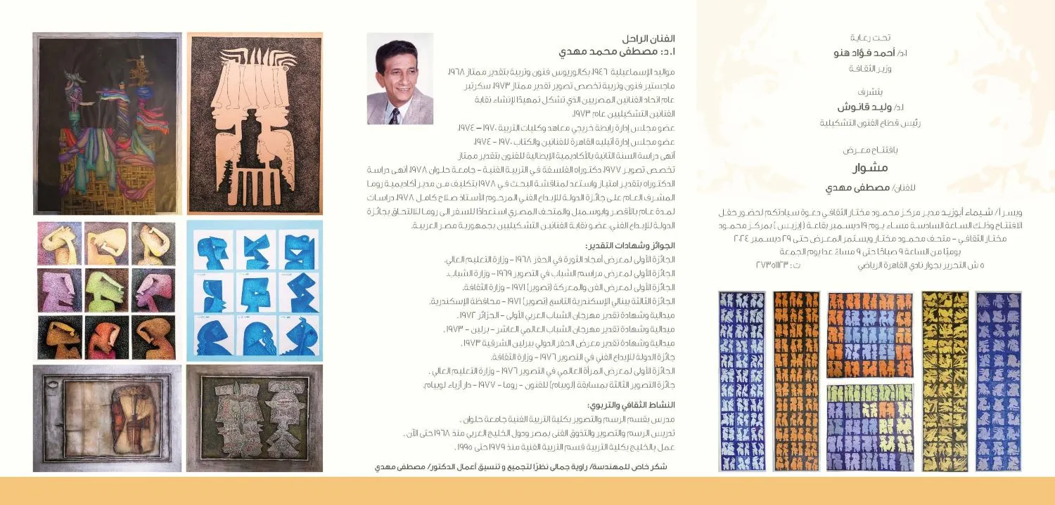 دعوة لمشاهدة "مشوار" مصطفى مهدى بمركز محمود مختار الثقافي برعاية أ.د/ أحمد فؤاد هنو وزير الثقافة يتفضل أ.د/ وليد قانوش رئيس قطاع الفنون التشكيلية بافتتاح معرض الفنان الراحل/ مصطفى مهدى تحت عنوان " مشوار " الساعة الـ 6 مساء يوم الخميس 19 ديسمبر 2024 بقاعة (إيزيس) بمركز محمود مختار الثقافي Mahmoud Mokhtar Cultural Center. يستمر المعرض حتى 29 ديسمبر 2024. لا تفوتوا فرصة حضور الافتتاح ومشاهدة المعرض مع عائلاتكم وأصدقائكم. الدخول مجاناً. المواعيد: يومياً من الساعة 9 صباحاً : الساعة 9 مساءً عدا يوم الجمعة. العنوان: 5 ش التحرير بجوار نادي القاهرة الرياضي. ت: 0227351123 #قطاع_الفنون_التشكيلية