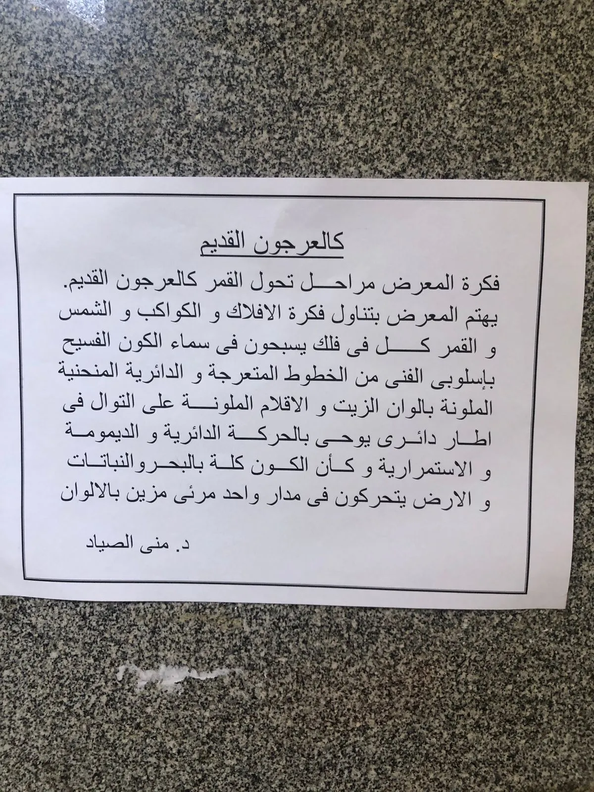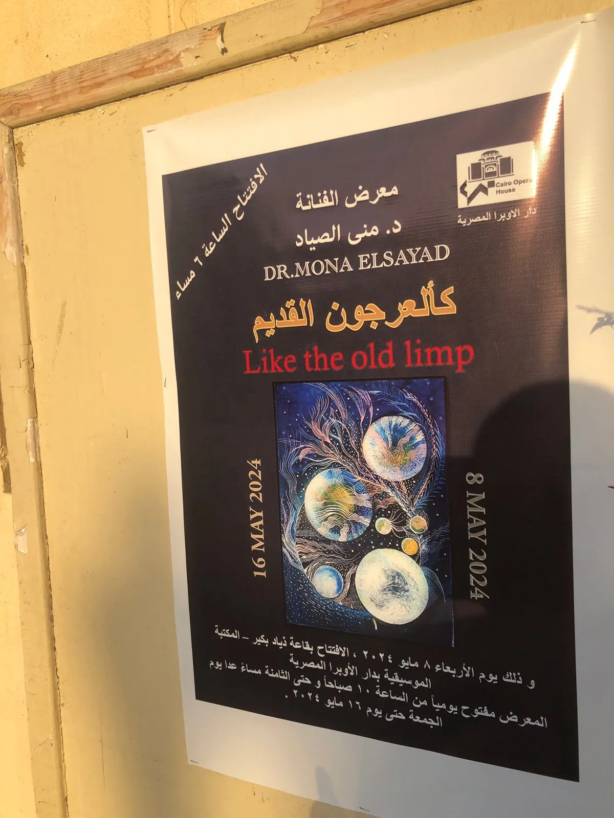 تستضيف قاعة زياد بكير بدار الأوبرا المصرية معرض بعنوان" كالعرجون القديم " للفنانة الدكتورة منى الصياد ويفتتح فى السادسة مساء الأربعاء 8 مايو ويستمر حتى الخميس 16 مايو . يضم المعرض 40 لوحة منفذة بخامات متنوعة منها الألوان الزيتية على كانفاس ، ورق الذهب والأقلام الملونة مستلهمة من علوم الفلك والكواكب والشمس والقمر وتتناول مراحل تطور القمر من خلال الخطوط المتعرجة والدائرية المنحنية التى توحى بالحركة والديمومة والإستمرارية . يذكر أن الفنانة منى الصياد حاصلة على بكالوريوس التربية الفنية جامعة حلوان ، دكتوراة في فلسفة التصميم ، عضو نقابة الفنانين التشكيليين ، شاركت في العديد من المعارض الفنية الجماعية داخل مصر وخارجها منها بينالى شرم الشيخ الدولي ويعد هذا المعرض الخامس لها خلال العام الحالى .