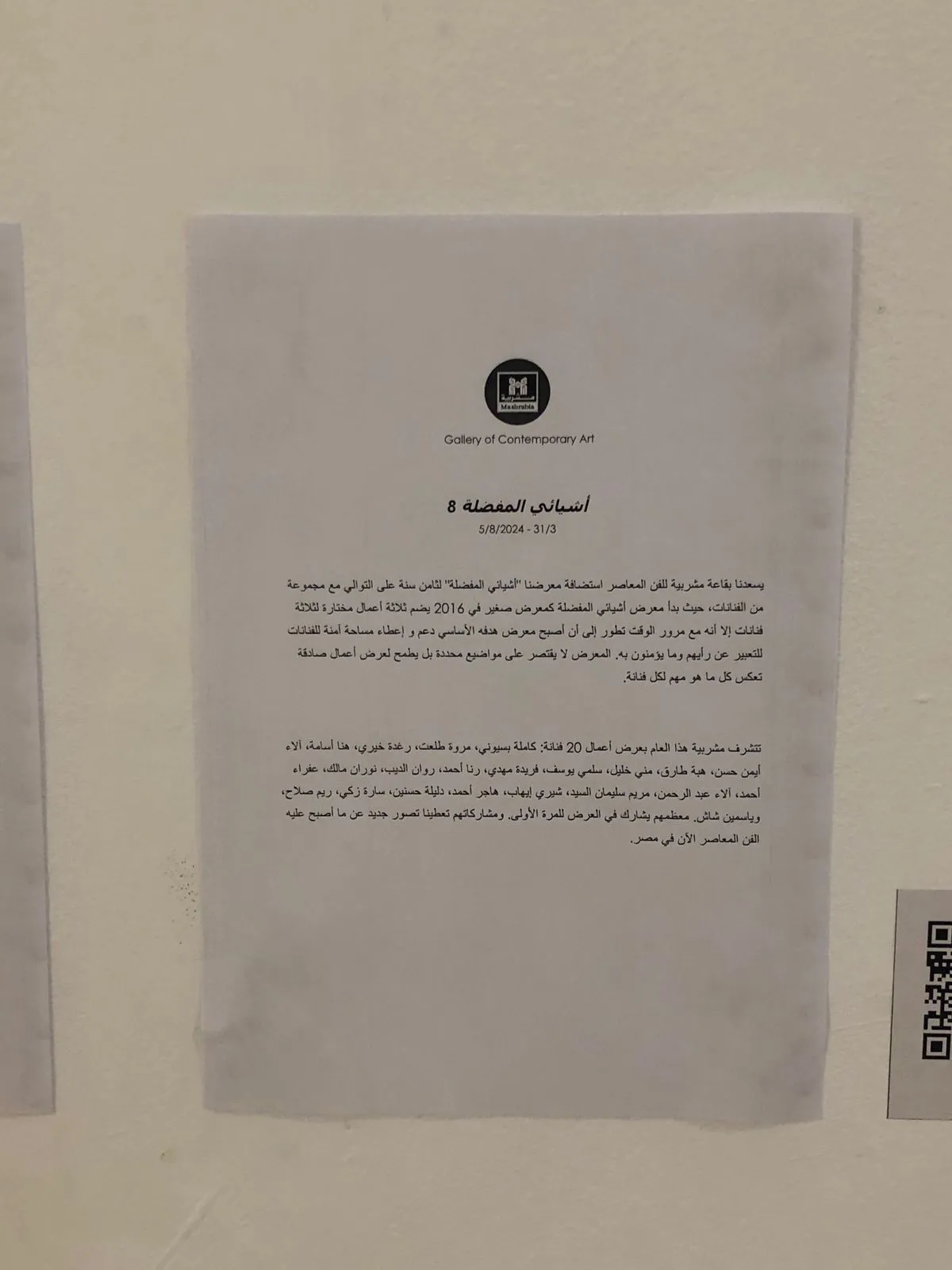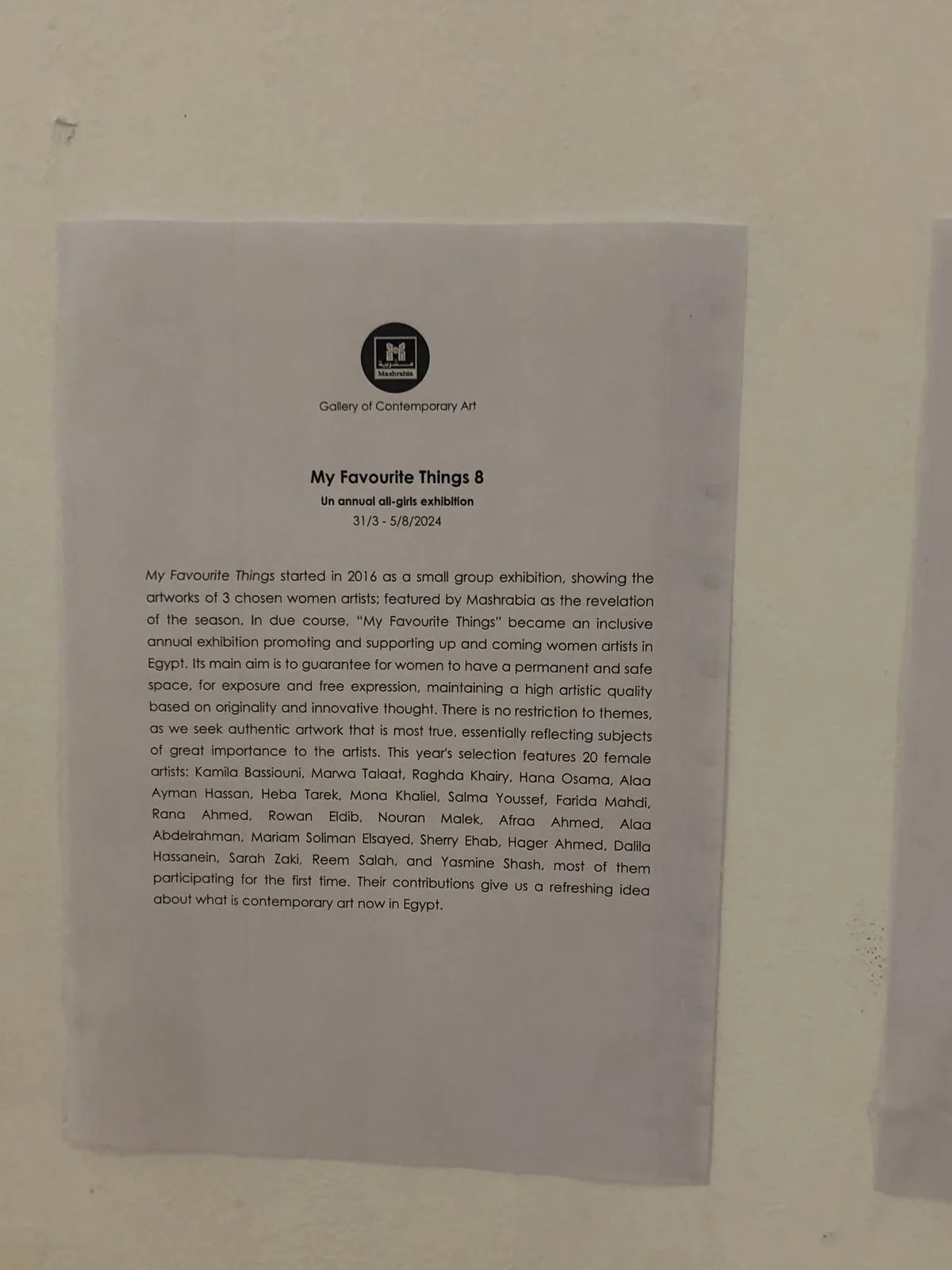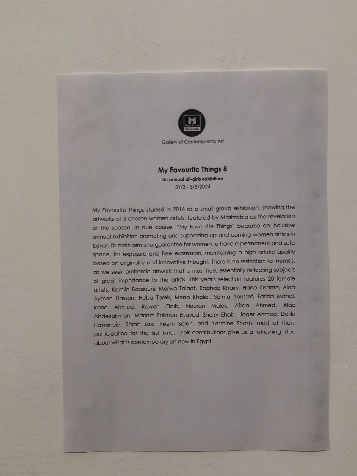 اشيائي المفضلة آلاء أيمن آلاء عبد الرحمن دليلة حسنين رغدة خيري رنا أحمد - روان الديب ريم صلاح سارة زكي سلمى يوسف شيري إيهاب عفرة أحمد فريدة مهدي كاملة بسيوني مروة طلعت مریم سلیمان منى خليل نوران مالك هاجر أحمد هبة طارق هنا أسامة 15, Mahmoud Bassiouny St., Downtown, Cairo, Egypt. Tel: +202 25784494-01001704554, www.mashrabiagallery.com, Daily except B. Friday from 11 am to 8 pm أشيائي المفضلة MY Favourite Things 8 An annual all-girls exhibition 31/3 - 8/5/2024