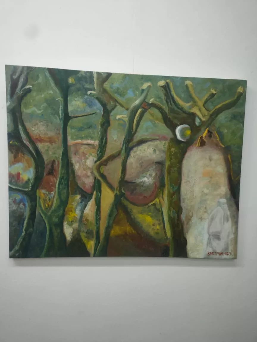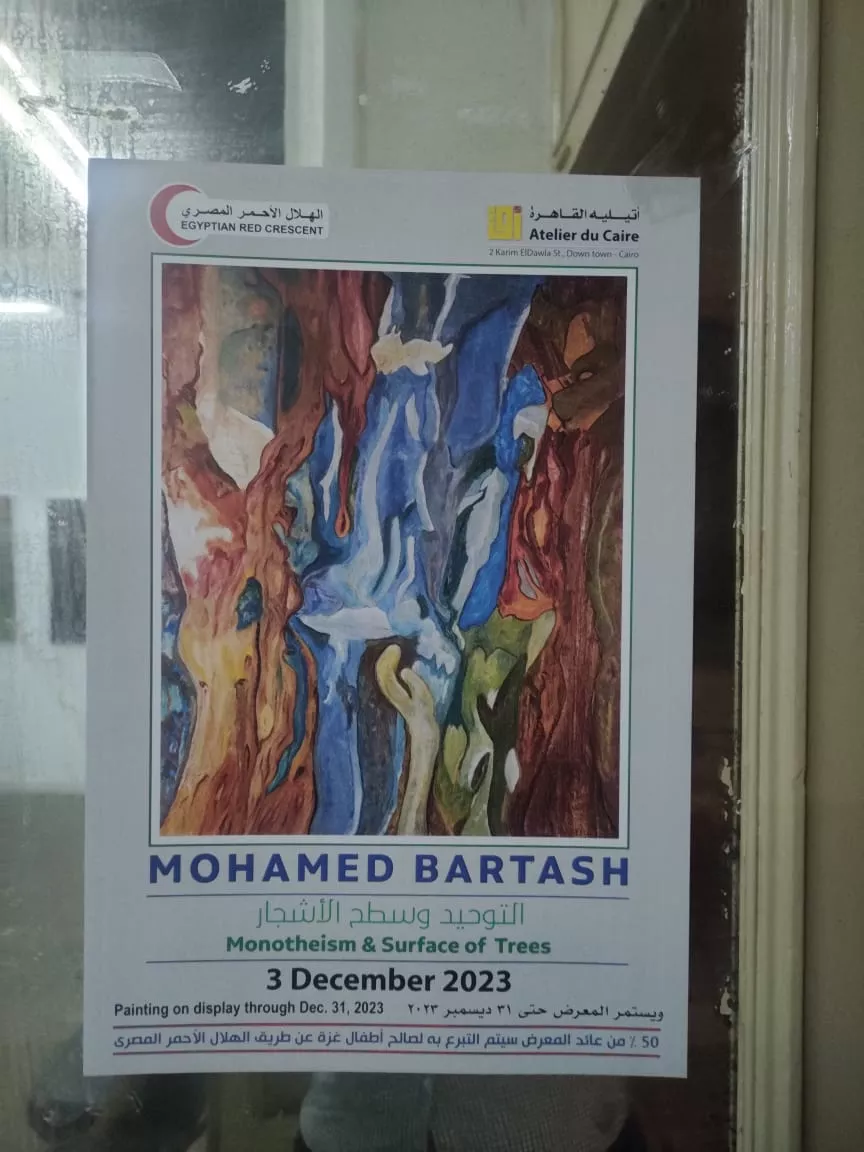 الهلال الأحمر المصري EGYPTIAN RED CRESCENT أتيليه القاهرة 5 Atelier du Caire 2 Karim ElDawla St.. Down town-Cairo MOHAMED BARTASH التوحيد وسطح الأشجار Monotheism & Surface of Trees 3 December 2023 Painting on display through Dec. 31, 2023 ويستمر المعرض حتى ۳۱ ديسمبر ۲۰۲۳ 50 % من عائد المعرض سيتم التبرع به لصالح أطفال غزة عن طريق الهلال الأحمر المصرى
