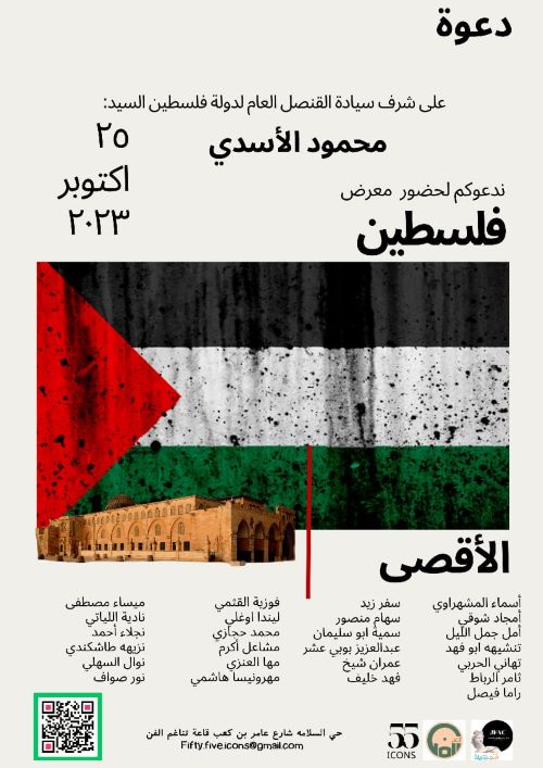 دعوة على شرف سيادة القنصل العام لدولة فلسطين السيد: محمود الأسدي ندعوكم لحضور معرض فلسطین الأقصى 25 اكتوبر 2023 أسماء المشهراوي أمجاد شوقي. أمل جمل الليل تنشيهه ابو فهد تهاني الحربي ثامر الرباط راما فيصل سفر زید سهام منصور سمية ابو سليمان عبد العزيز بوبي عشر. عمران شیخ فهد خليف فوزية القثمي ليندا اوغلى محمد حجازي مشاعل أكرم مها العنزي مهرونيسا هاشمي ميساء مصطفى نادية اللياتي نجلاء أحمد نزيهه طاشكندي نوال السهلي نور صواف حي السلامه شارع عامر بن كعب قاعة تناغم الفن Fifty five icons@gmail.com