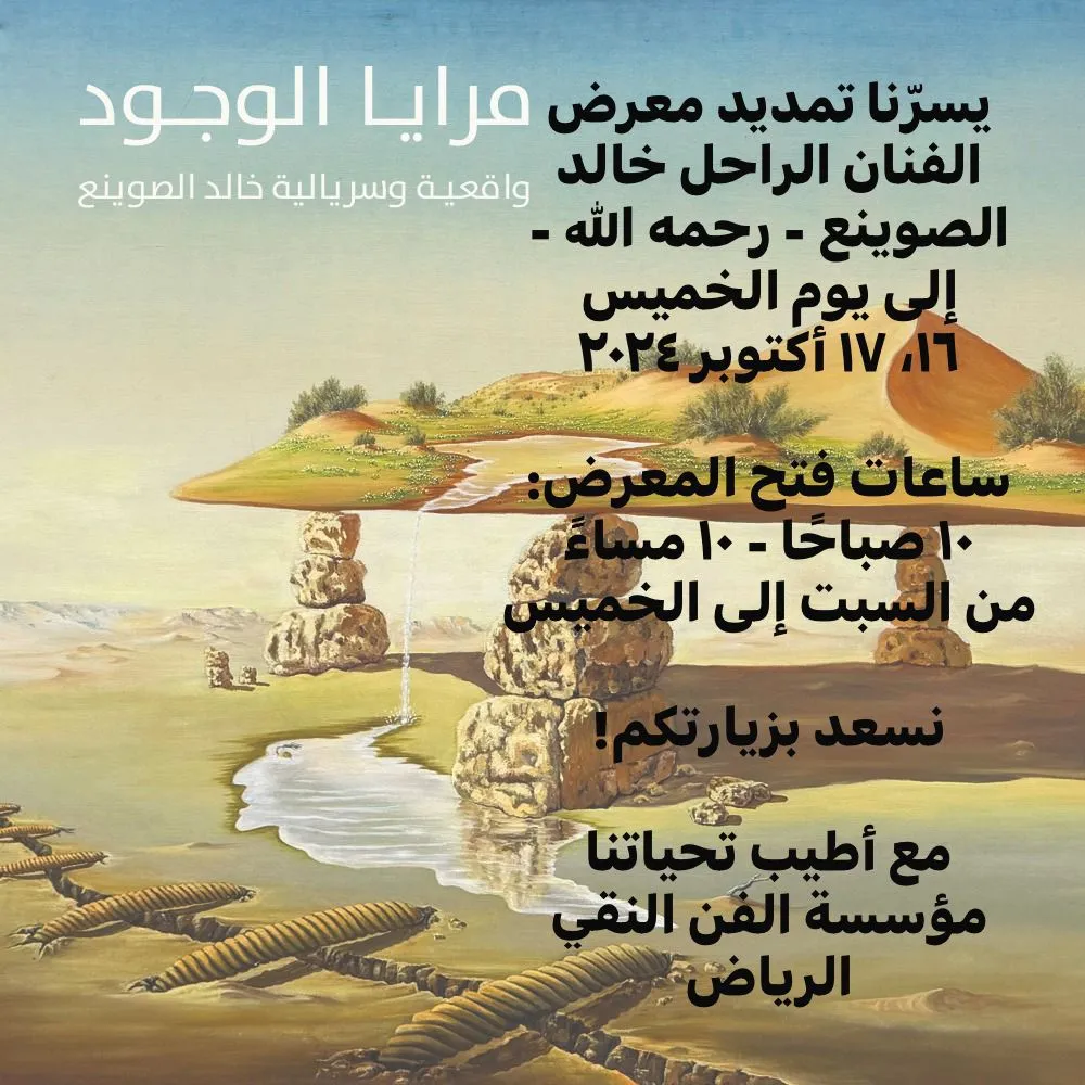 مرايا الوجودواقعية وسريالية خالد الصوينعيسر مؤسسة الفن النقي دعوتكم لحضور افتتاح المعرض الفردي للفنان السعودي الراحل خالد الصوينعالاثنين، ١٦ سبتمبر ٢٠٢٤۷:۳۰ - ١٠ مساءًغاليري الفن النقي، الرياضيستمر المعرض إلى 17 اكتوبر ٢٠٢٤