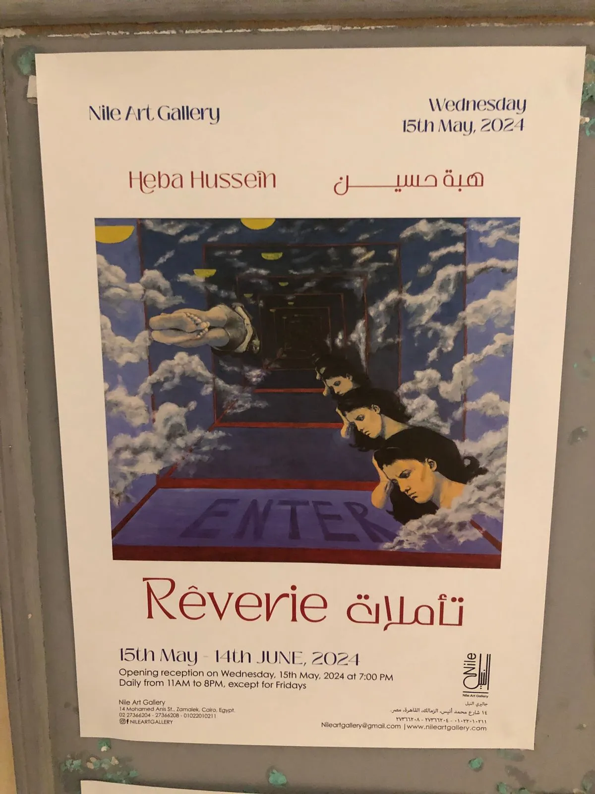 يسعدنا دعوتكم لحضور معرض منفرد للفنانة هبة حسين بعنوان "تأملات". 2024-05-15 - ١٤-٠٦-٢٠٢٤ تفتح الأبواب من الساعة 7:00 مساءً فصاعداً (نرجو منكم التكرم بتنظيم أوقات وصولكم وفقاً لذلك) Nile Art Gallery 14شارع محمد أنيس، الزمالك، القاهرة، مصر انضموا إلينا في أمسية مميزة بينما نقدم لكم إبداعات هبة حسين الرائعة. انغمسوا في عالم من التعبير الفني واستكشفوا منظور الفنانة الفريد من خلال أعمالها