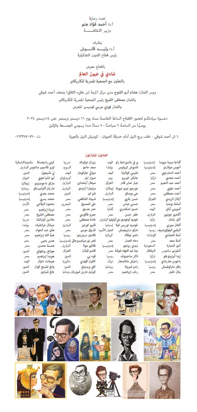 في إطار احتفال وزارة الثقافة بالفنان الكبير شادي عبد السلام ندعوكم لحضور افتتاح معرض "شادي في عيون العالم" بمشاركة نخبة من الفنانين المصريين والأجانب والذي يفتتحه أ.د/ وليد قانوش رئيس قطاع الفنون التشكيلية يوم الاربعاء الموافق 11 ديسمبر 2024 الساعة 5 مساء بمركز كرمة بن هانئ الثقافي بمتحف أحمد شوقي، بالتعاون مع الجمعية المصرية للكاريكاتير برئاسة الفنان/ مصطفى الشيخ والفنان/ فوزي مرسي - قومسير المعرض. يستمر المعرض حتى 14 ديسمبر 2024. يسعدنا تشريفكم. الدخول مجاناً. المواعيد: يومياً من الساعة 9 صباحاً : الساعة 9 مساءً عدا يومي الجمعة والاثنين. العنوان: 6 ش أحمد شوقي – خلف برج النيل أمام حديقة الحيوان – كورنيش النيل بالجيزة. ت: 0235707960 #قطاع_الفنون_التشكيلية متحف أحمد شوقي Ahmed Shawqi Museum