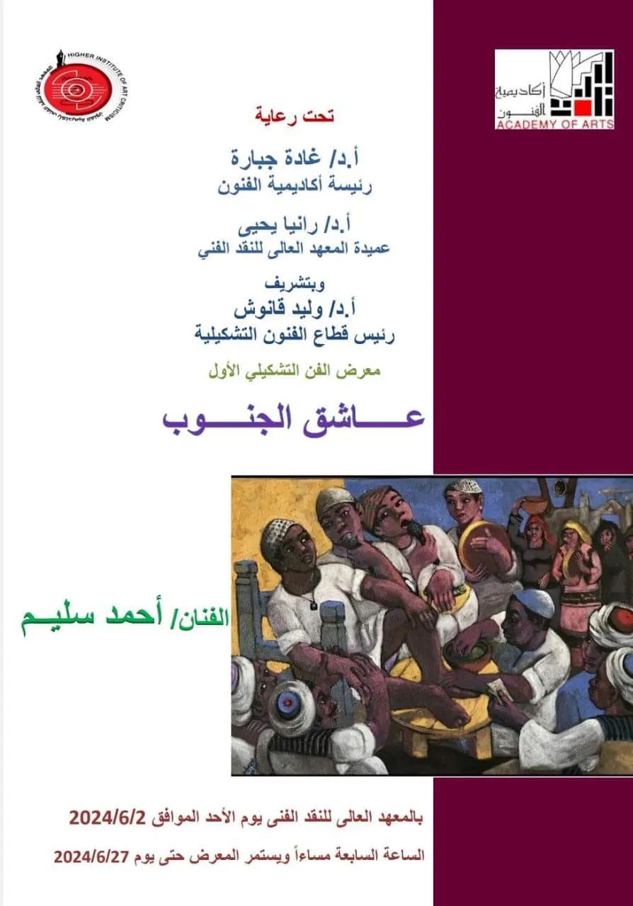 عاشق الجنوب تحت رعاية الأستاذة الدكتوره / غاده جباره رئيس الأكاديمية يفتتح المعهد العالي للنقد الفني معرض عاشق الجنوب للفنان الدكتور / احمد سليم بقاعة الفنون التشكيلية بالمعهد العالي للنقد الفني الافتتاح يوم الأحد الموافق 4/٦/٢٠٢٤ من الساعه 7 مساءً الي الساعه 9 مساءً للاستاذ الدكتور / احمد سليم استاذ التصوير بكلية الفنون الجميلة جامعة المنيا أكاديمية الفنون ACADEMY OF ARTS
