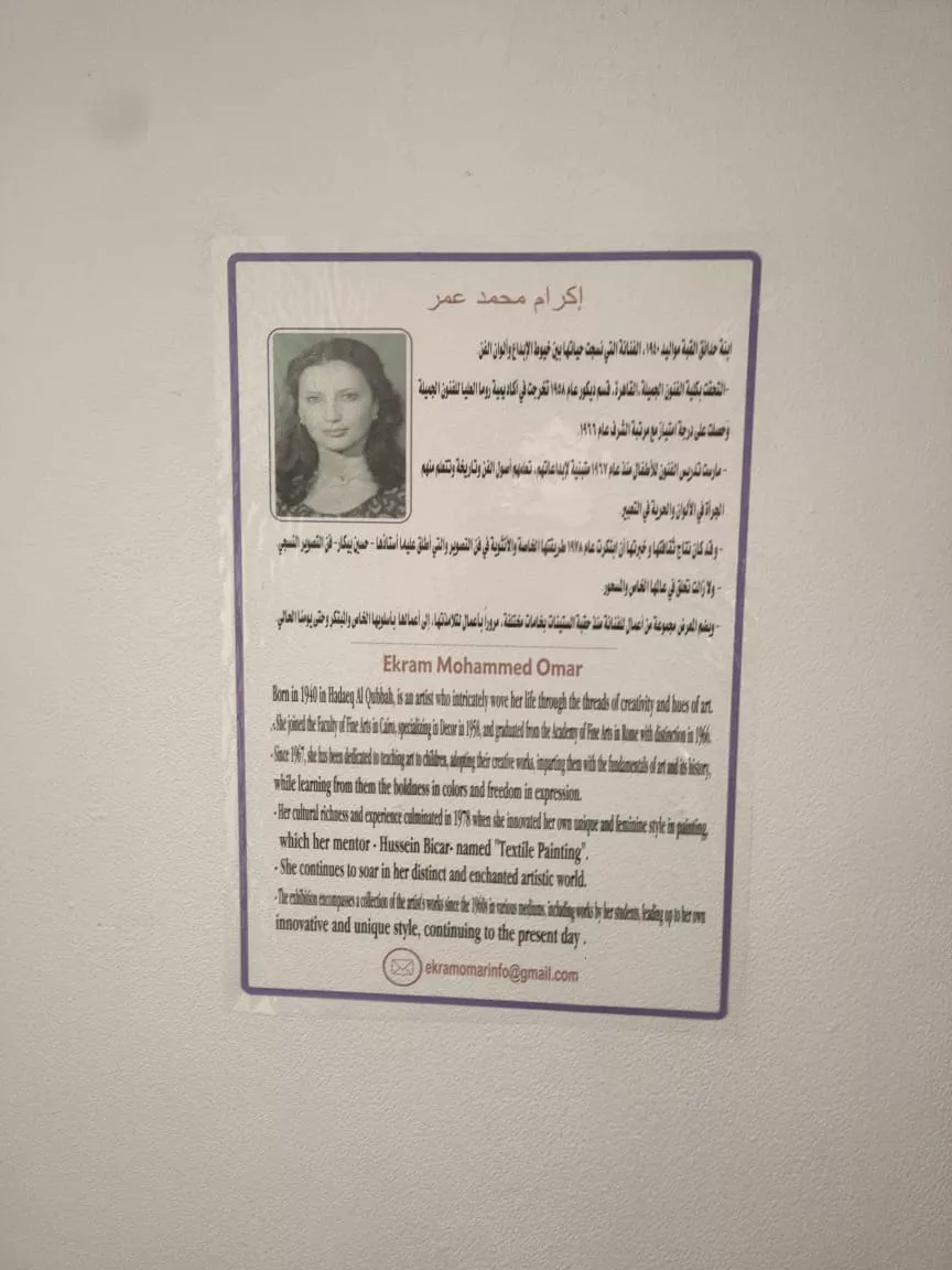 حواديت منسوجة من حرير Stories Woven from Silk إكرام عمر Ekram Omar الافتتاح الساعة السابعة مساء يوم 13 ديسمبر ويستمر حتى 24 ديسمبر 2023 بقاعات العرض بمركز الجزيرة للفنون يوميا من الساعة 9 صباحا : 9 مساءً عدا الجمعة مركز الجزيرة للفنون : 1 شارع الشيخ المرصفي بالزمالك وزارة الثقافة - قطاع الفنون التشكيلية
