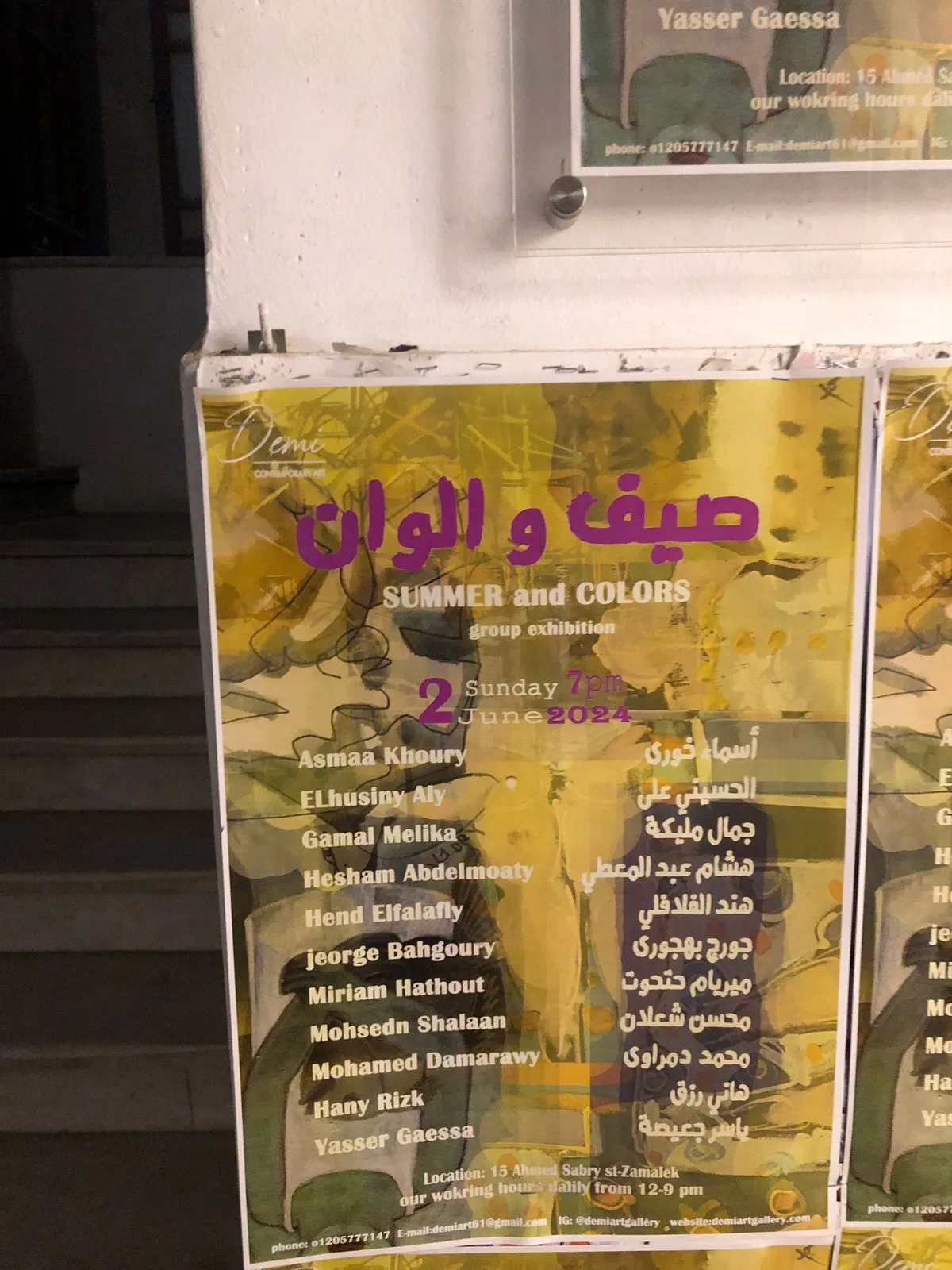 يسر معرض ديمي آرت دعوتكم لحضور افتتاح المعرض الجماعي "صيف وألوان"معرض جماعي للفنانين :أسماء خوريالحسيني عليجمال مليكاهشام عبد المعطيمحسن شعلانمحمد دمراويهند الفلافليجورج بهجوريميريام حتحوتهاني رزقياسر جعيصة
