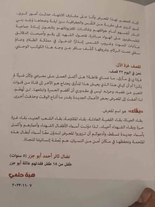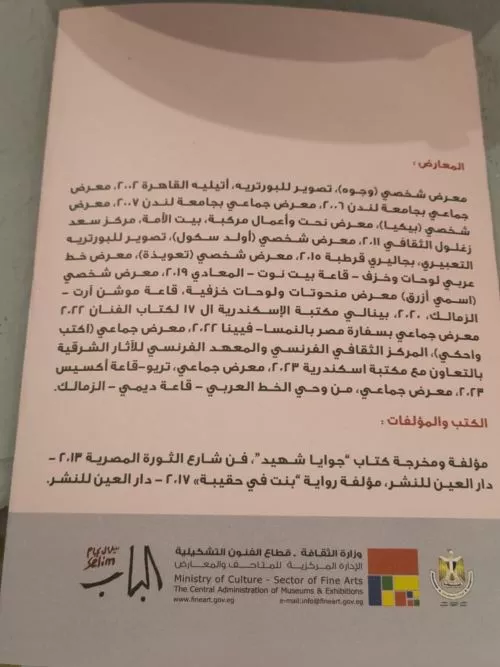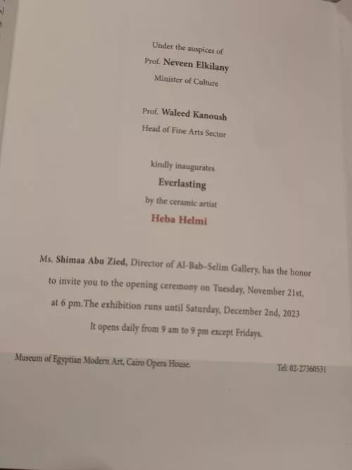 تحت رعاية ا. د نيفين الكيلاني وزير الثقافة يتشرف ا. د/ وليد قانوش رئيس قطاع الفنون التشكيلية بافتتاح معرض «بقاء» للفنانة / هبة حلمي ويسر أ / شيماء أبو زيد مدير قاعة الباب سليم دعوة سيادتكم لحضور حفل الافتتاح الساعة السادسة مساء يوم الثلاثاء الموافق ۲۱ نوفمبر ويستمر المعرض حتى يوم السبت الموافق ٢ ديسمبر ۲۰۲۳ يوميا من الساعة 9 صباحا وحتى الساعة 9 مساءً عدا يوم الجمعة متحف الفن المصري الحديث - دار الأوبرا المصرية ت : ٠٢٢٧٣٦٠٥٣١