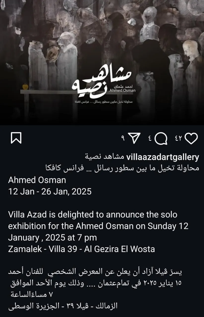 يسر فيلا آزاد أن يعلن عن المعرض الشخصي للفنان أحمد عثمان مشاهد نصية في تمام ٠٧ مساءا وذلك يوم الأحد الموافق ١٢ يناير ٢٠٢٥ وحتى ٢٦ يناير ٢٠٢٥ الزمالك - فيلا ۳۹ - الجزيرة الوسطى