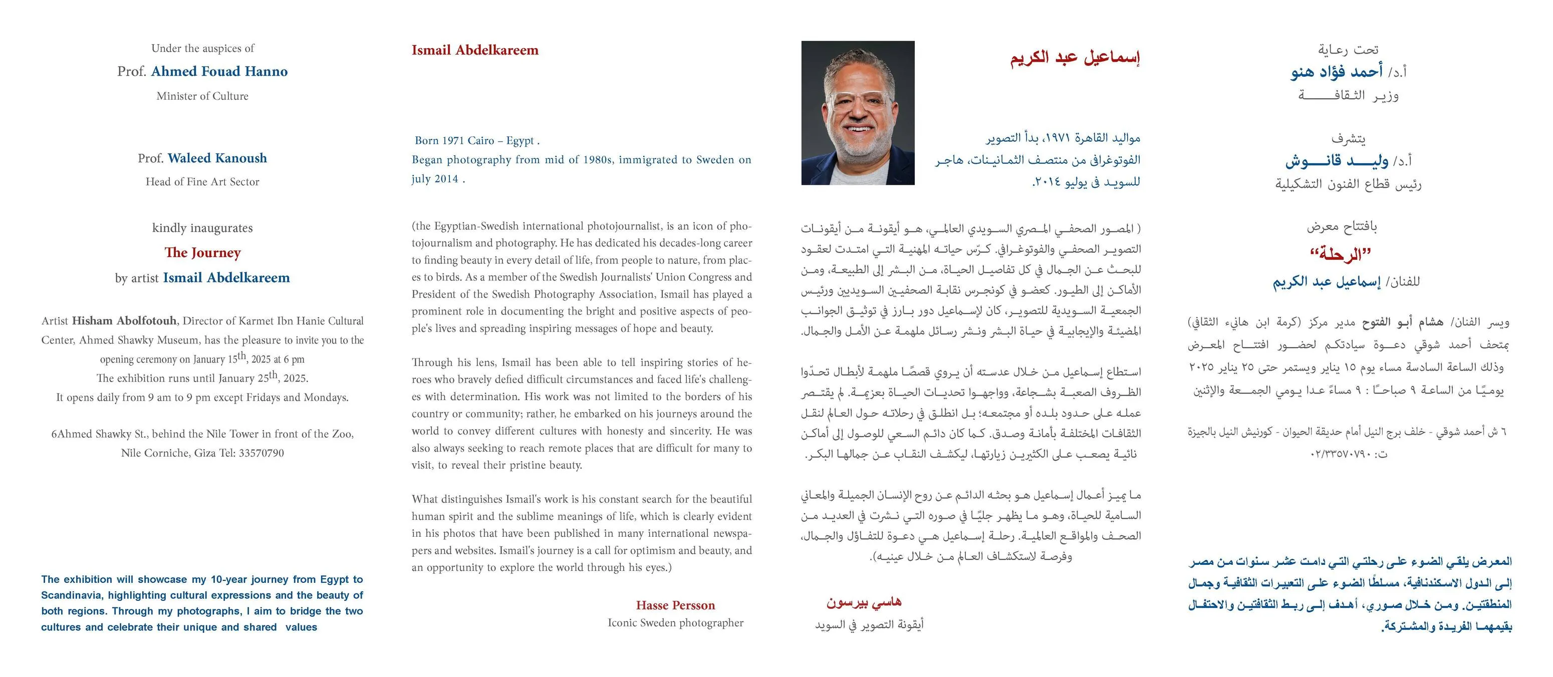 بحضور سفيرة النرويج بالقاهرة السيدة/ هيلدا كليميتسدال تم افتتاح معرض "الرحلة" للفنان إسماعيل عبد الكريم، بمركز كرمة ابن هانئ الثقافى بمتحف احمد شوقى متحف أحمد شوقي Ahmed Shawqi Museum مساء الأربعاء 15يناير 2025. المعرض يلقي الضوء على رحلة الفنان التي دامت عشر سنوات ما بين مصر والدول الاسكندنافية وتوضح الصور الثقافات المختلفة وجمال الطبيعة بكل دولة. يستمر المعرض حتى 25 يناير 2025. دايماً سعداء بوجودكم. مواعيد الزيارة من 9 صباحا الى 9 مساء عدا يومي الجمعة والاثنين