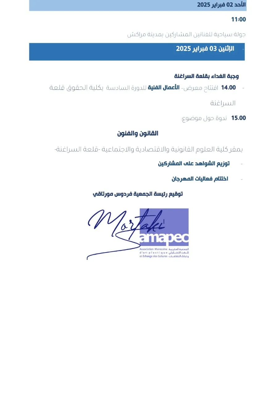 الجمعة 31 يناير 2025 استقبال المشاركين 11:00 زيارة معرض الصور الفوتوغرافية بقاعة المعارض دار الثقافة - سيدي رحال تحت عنوان - مرايا الصمت بأطراف واد غدات . للفنانين الفوتوغرافيين سعيدة بونا ورشيد مورتاقي - جولة بالمدينة وحضور نشاط في فن التبوريدة المغربية وجبة الغداء العرض الأول للشريط الوثائقي الخاص بمدينة سيدي رحال - يقولون التنوع يثري الحياة - - إخراج المخرج الألماني Saffyan Mirza السبت 01 فبراير 2025 10:00 بمدينة سيدي رحال الشروع في ورشة الجداريات الشروع في ورشات الأعمال الفنية بحجارة واد غذات الشروع في ورشات الرسم للفنانين المشاركين 20.00 العرض الثاني للشريط الوثائقي الخاص بمدينة سيدي رحال - يقولون التنوع يثري الحياة - بالهواء الطلق لساكنة المدينة - إخراج المخرج الألماني Saffyan Mirza الأحد 02 فبراير 2025 11:00 جولة سياحية للفنانين المشاركين بمدينة مراكش الإثنين 03 فبراير 2025 وجبة الغداء بقلعة السراغنة 14.00 افتتاح معرض الأعمال الفنية للدورة السادسة بكلية الحقوق قلعة السراغنة 15.00 ندوة حول موضوع القانون والفنون بمقر كلية العلوم القانونية والاقتصادية والاجتماعية - قلعة السراغنة توزيع الشواهد على المشاركين اختتام فعاليات المهرجان توقيع رئيسة الجمعية فردوس مورتاقي