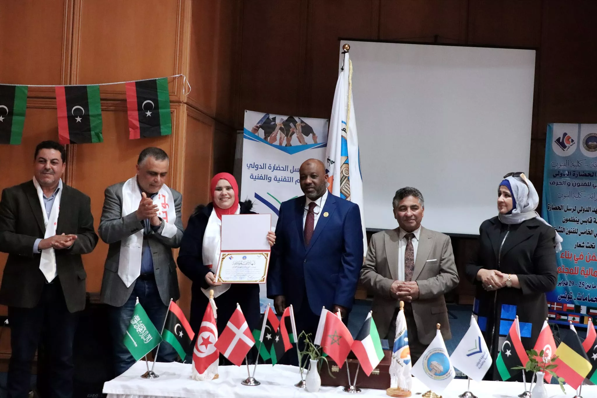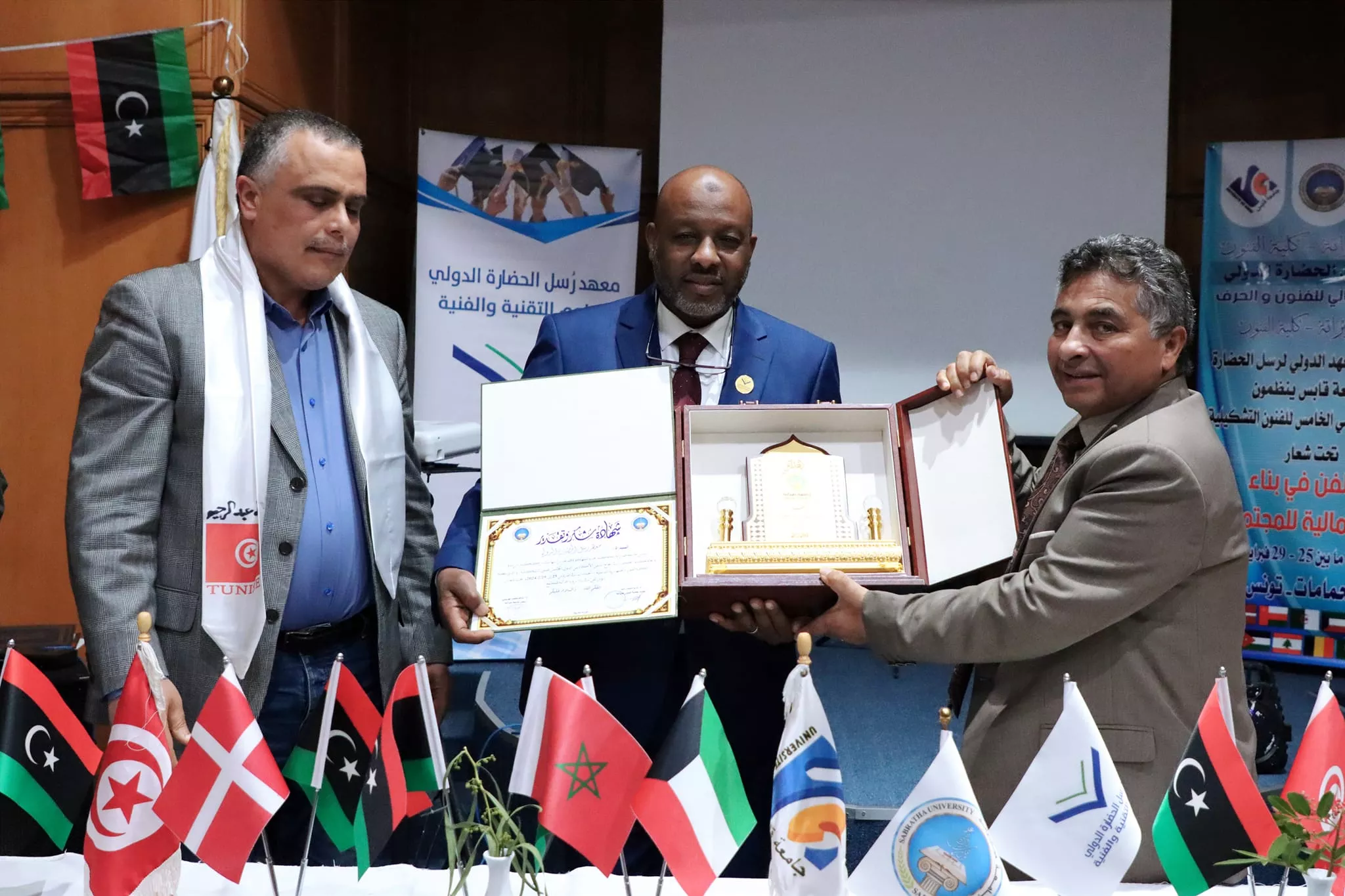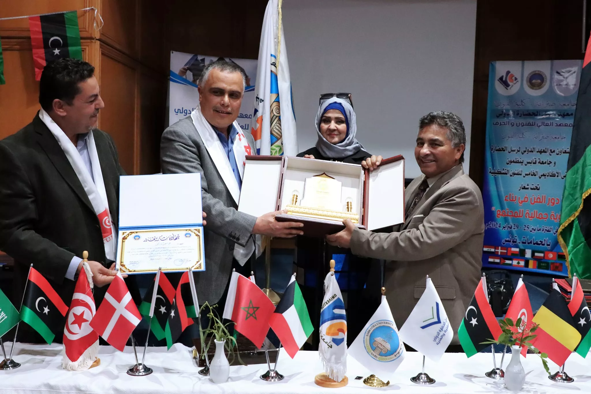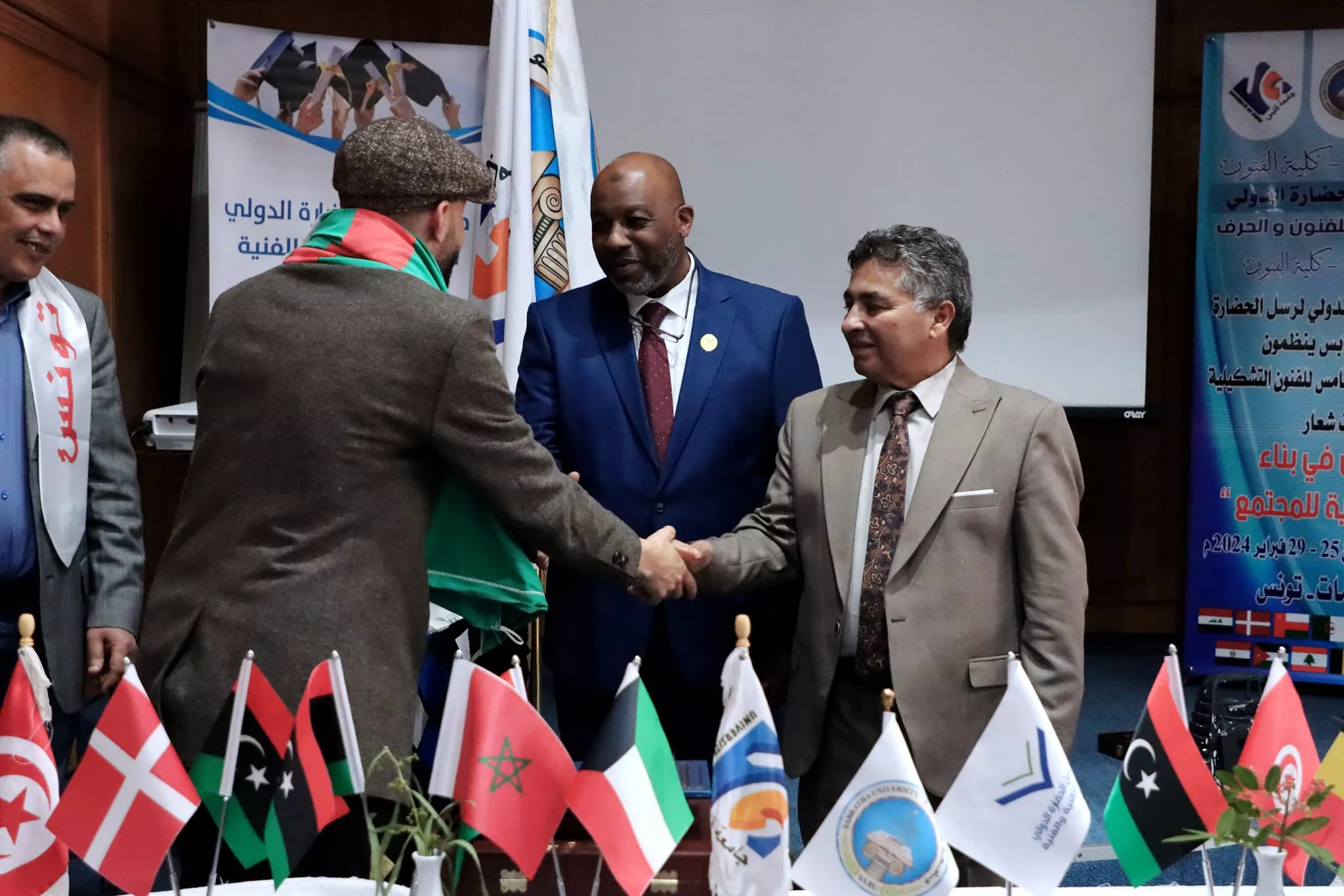 اختتام فعاليات الملتقى الأكاديمي الدولي الخامس للفنون التشكيلية الذي نظم بالتعاون بين كلية الفنون جامعة صبراتة والمعهد العالي للفنون والحرف بجامعة قابس التونسية ومعهد رسل الحضارة بليبيا اختتمت مساء اليوم الاربعاء الموافق 28 فبراير 2024م فعاليات الملتقى الأكاديمي الدولي الخامس للفنون التشكيلية الذي نظم بالتعاون بين كلية الفنون جامعة صبراتة والمعهد العالي للفنون والحرف بجامعة قابس التونسية ومعهد رسل الحضارة، حيث احتضنت مدينة الحمامات التونسية فعاليات الملتقى الذي استمر على مدى 4 ايام متتالية بمشاركة عدد كبير من الأكاديميين والفنانين والمتخصصين في مجال الفنون من مختلف الدول العربية والأجنبية تخلل حفل الختام عدد من الكلمات التي ألقاها السادة ممثلي الجهات المنظمة والمساهمة في تنظيم الملتقى، وتم تقديم عرض مرئي تضمن أبرز الفعاليات والمناشط التي تخللت الملتقى ، عقب ذلك تم توزيع شهادات المشاركة على المشاركين في الفعاليات وكذلك تكريم الجهات التي دعمت وساهمت في إقامة هذا المنشط الفني الدولي الكبير وبعد الانتهاء من مراسم التكريم توجه الحضور إلى افتتاح المعرض الفني الذي احتوى على لوحات من الفنون التشكيلية عكست التنوع الفني الذي كان سمه بارزه من سمات الملتقى هذا وشهد الحفل الختامي للملتقى حضور رئيس جامعة صبراتة أ.د سالم الهريشي وعميد كلية الفنون جامعة صبراتة د. ثريا راشد ورئيس المعهد العالي للفنون والحرف جامعة قابس ورئيس معهد رسل الحضارة، وممثل عن جامعة قابس د. حافظ عبدالرحيم، إلى جانب عدد من أساتذة كلية الفنون ولفيف من المدعوين والمهتمين بالمجال الفني تمنياتنا دوام التوفيق والنجاح لكل من يمثل جامعتنا محلياً ودولياً في مختلف المناشط والمجالات