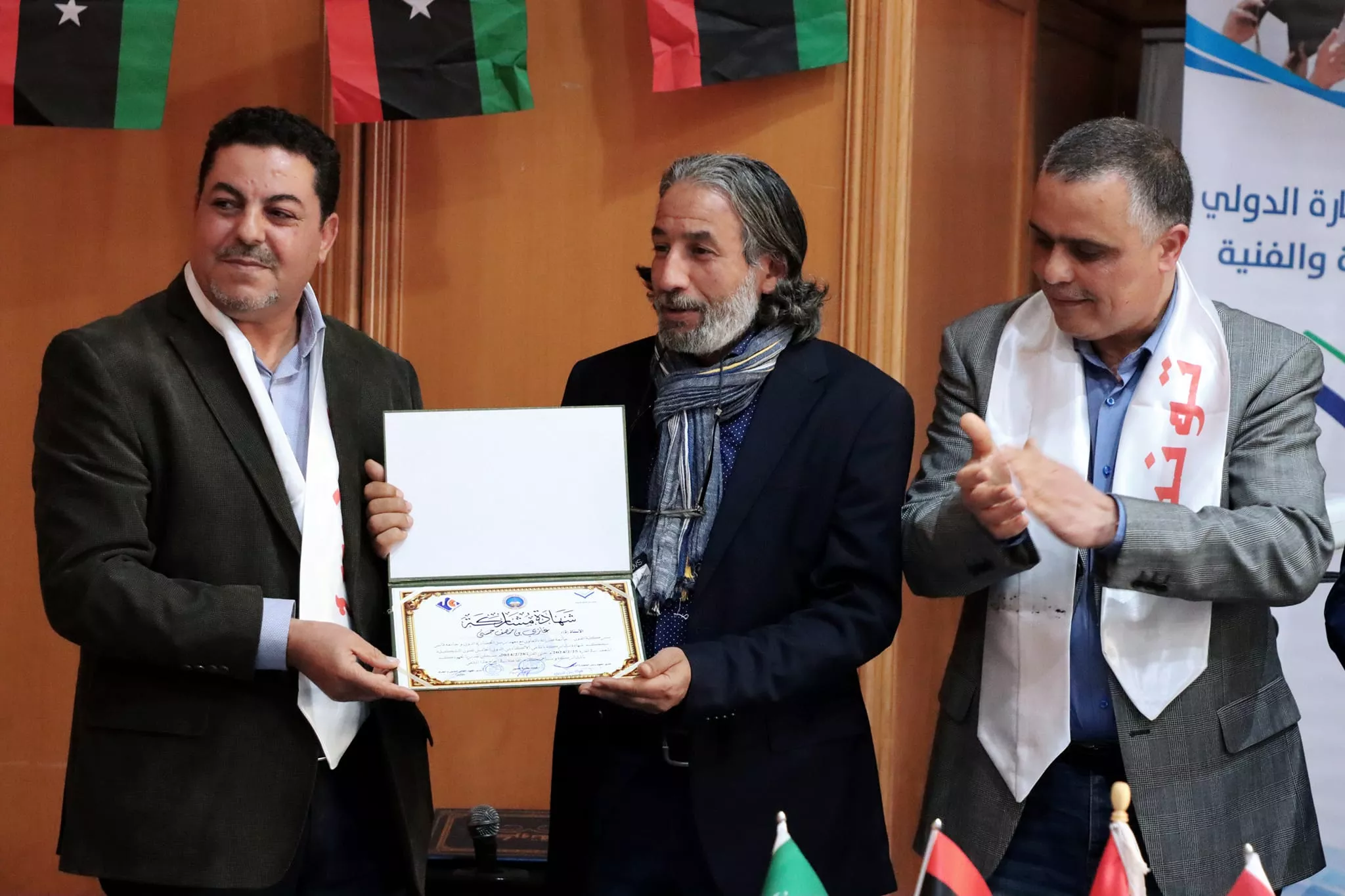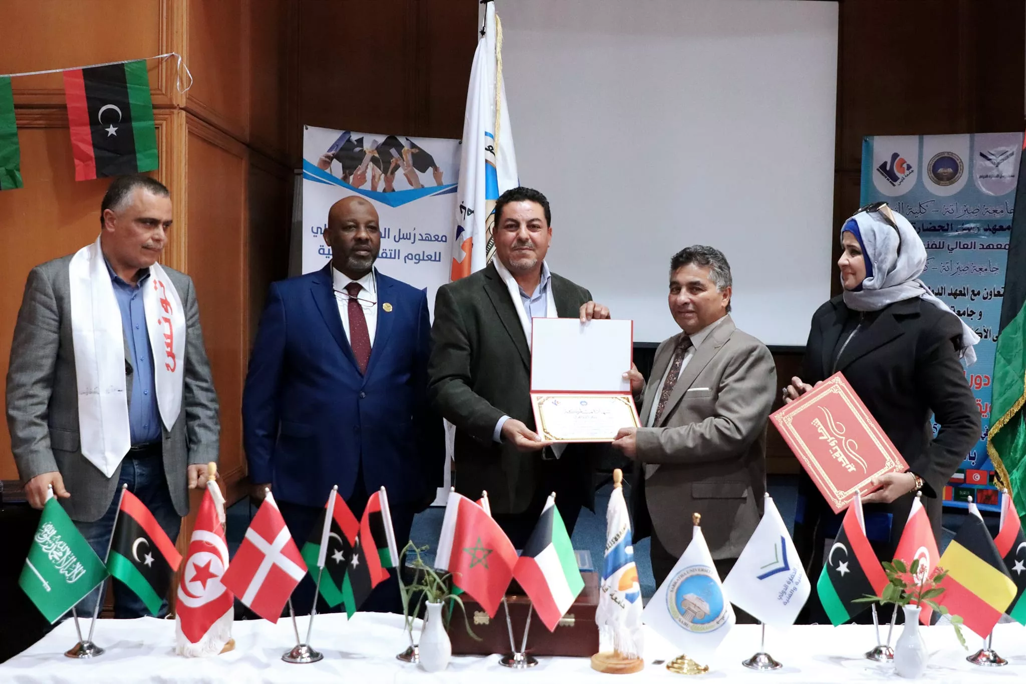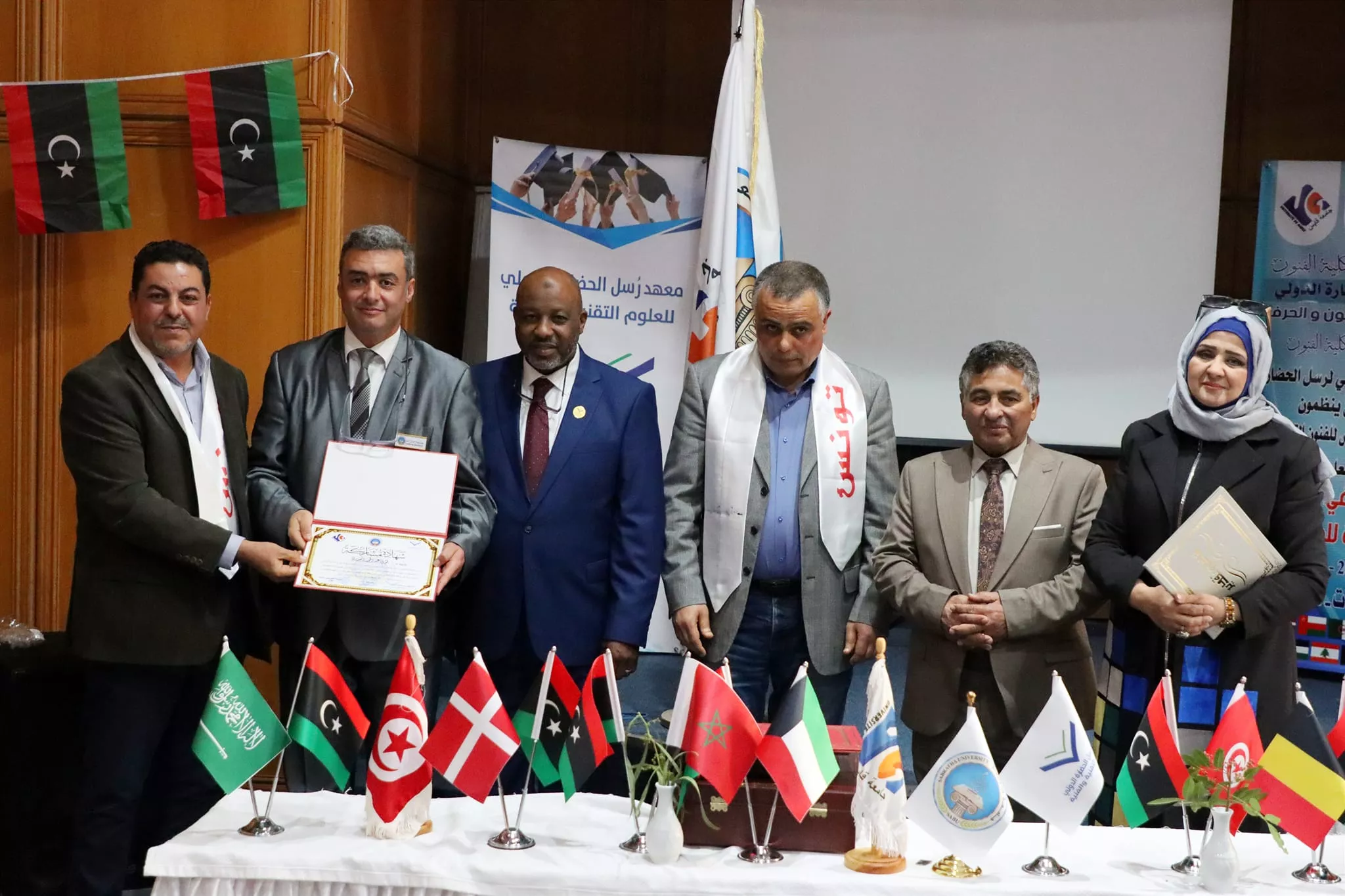 اختتام فعاليات الملتقى الأكاديمي الدولي الخامس للفنون التشكيلية الذي نظم بالتعاون بين كلية الفنون جامعة صبراتة والمعهد العالي للفنون والحرف بجامعة قابس التونسية ومعهد رسل الحضارة بليبيا اختتمت مساء اليوم الاربعاء الموافق 28 فبراير 2024م فعاليات الملتقى الأكاديمي الدولي الخامس للفنون التشكيلية الذي نظم بالتعاون بين كلية الفنون جامعة صبراتة والمعهد العالي للفنون والحرف بجامعة قابس التونسية ومعهد رسل الحضارة، حيث احتضنت مدينة الحمامات التونسية فعاليات الملتقى الذي استمر على مدى 4 ايام متتالية بمشاركة عدد كبير من الأكاديميين والفنانين والمتخصصين في مجال الفنون من مختلف الدول العربية والأجنبية تخلل حفل الختام عدد من الكلمات التي ألقاها السادة ممثلي الجهات المنظمة والمساهمة في تنظيم الملتقى، وتم تقديم عرض مرئي تضمن أبرز الفعاليات والمناشط التي تخللت الملتقى ، عقب ذلك تم توزيع شهادات المشاركة على المشاركين في الفعاليات وكذلك تكريم الجهات التي دعمت وساهمت في إقامة هذا المنشط الفني الدولي الكبير وبعد الانتهاء من مراسم التكريم توجه الحضور إلى افتتاح المعرض الفني الذي احتوى على لوحات من الفنون التشكيلية عكست التنوع الفني الذي كان سمه بارزه من سمات الملتقى هذا وشهد الحفل الختامي للملتقى حضور رئيس جامعة صبراتة أ.د سالم الهريشي وعميد كلية الفنون جامعة صبراتة د. ثريا راشد ورئيس المعهد العالي للفنون والحرف جامعة قابس ورئيس معهد رسل الحضارة، وممثل عن جامعة قابس د. حافظ عبدالرحيم، إلى جانب عدد من أساتذة كلية الفنون ولفيف من المدعوين والمهتمين بالمجال الفني تمنياتنا دوام التوفيق والنجاح لكل من يمثل جامعتنا محلياً ودولياً في مختلف المناشط والمجالات