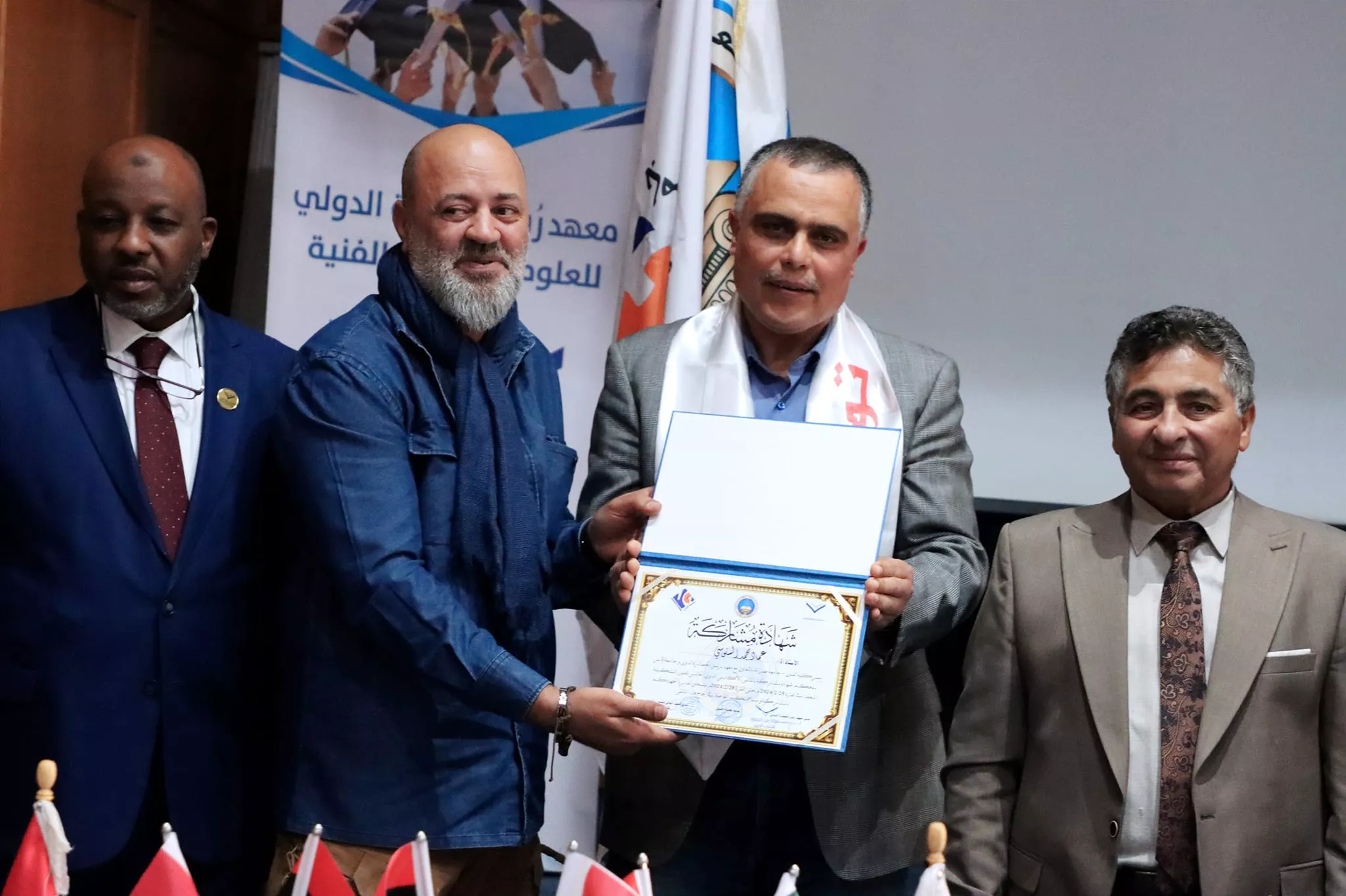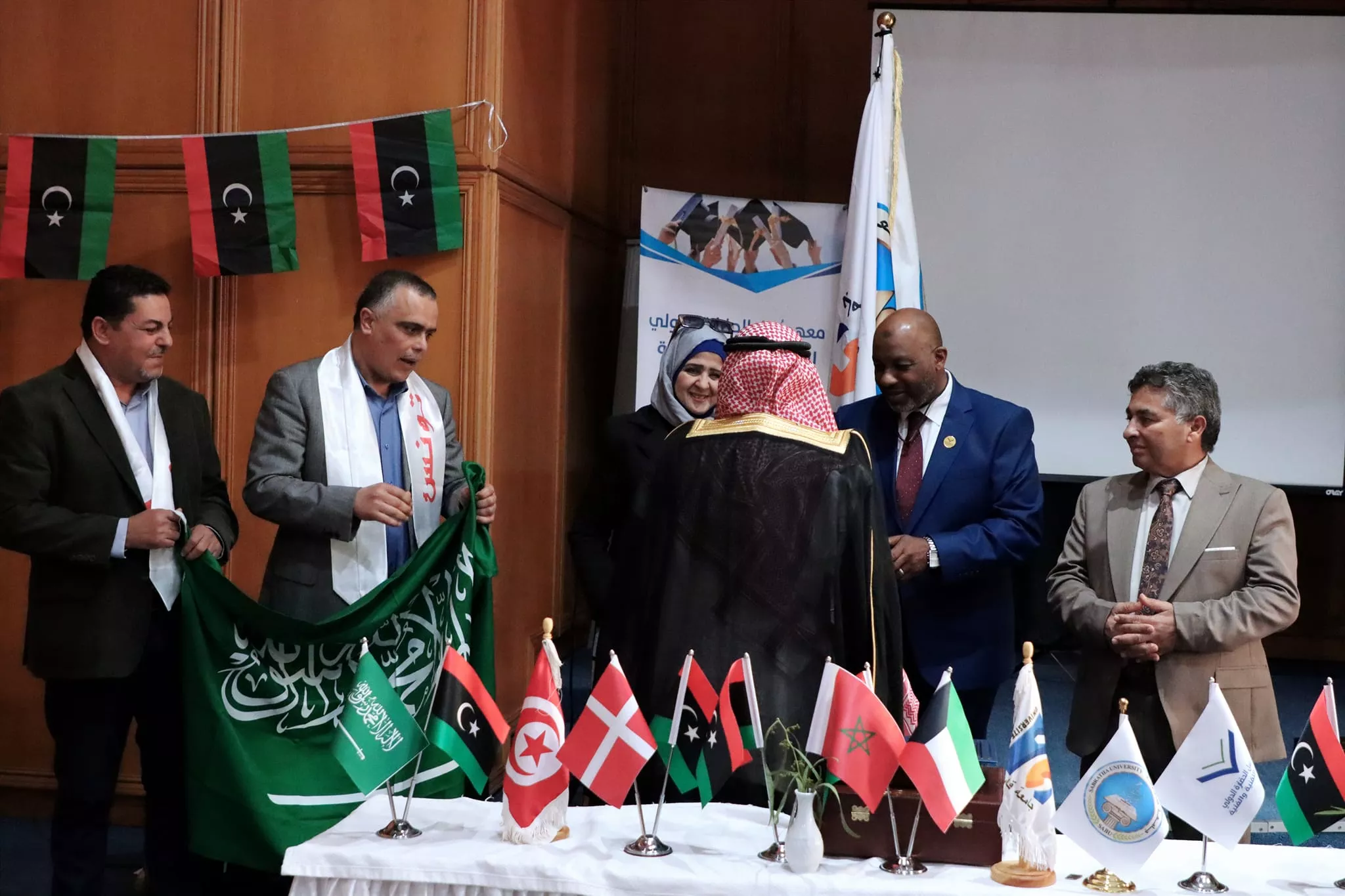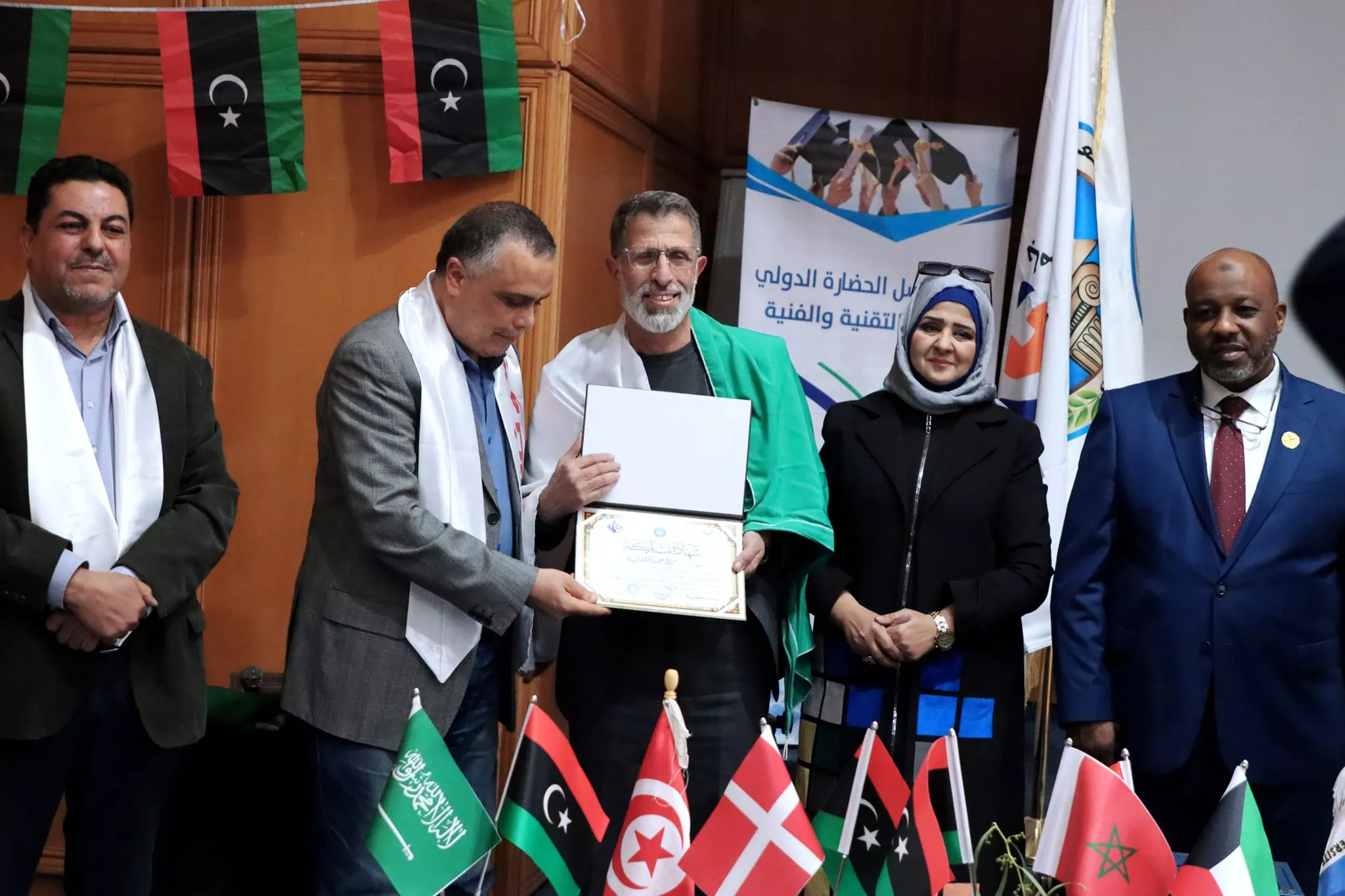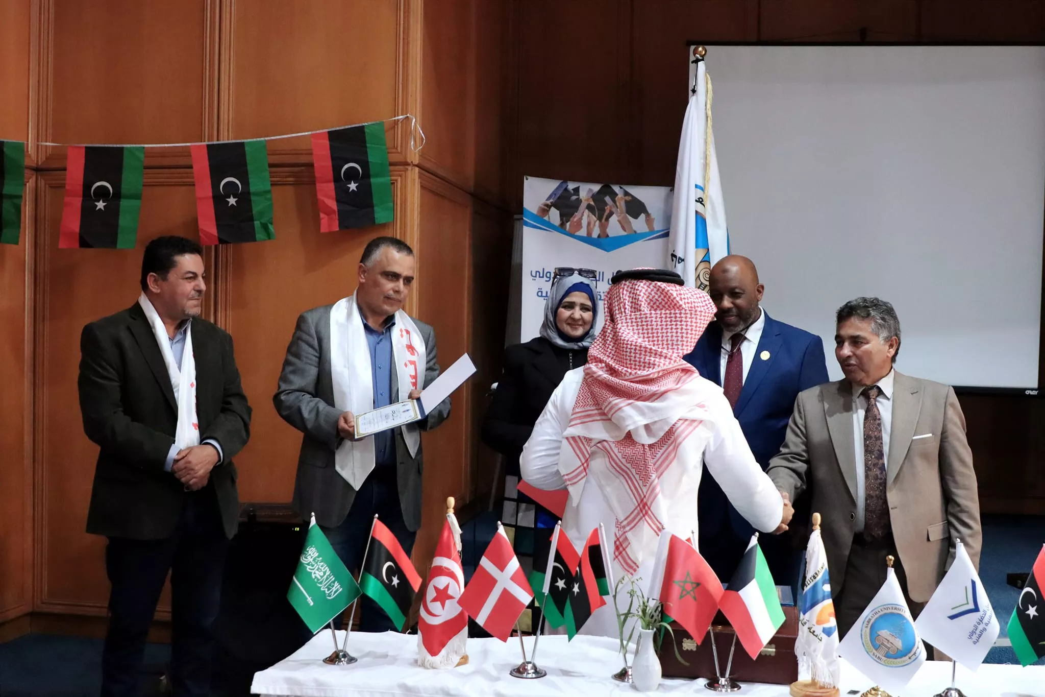 اختتام فعاليات الملتقى الأكاديمي الدولي الخامس للفنون التشكيلية الذي نظم بالتعاون بين كلية الفنون جامعة صبراتة والمعهد العالي للفنون والحرف بجامعة قابس التونسية ومعهد رسل الحضارة بليبيا اختتمت مساء اليوم الاربعاء الموافق 28 فبراير 2024م فعاليات الملتقى الأكاديمي الدولي الخامس للفنون التشكيلية الذي نظم بالتعاون بين كلية الفنون جامعة صبراتة والمعهد العالي للفنون والحرف بجامعة قابس التونسية ومعهد رسل الحضارة، حيث احتضنت مدينة الحمامات التونسية فعاليات الملتقى الذي استمر على مدى 4 ايام متتالية بمشاركة عدد كبير من الأكاديميين والفنانين والمتخصصين في مجال الفنون من مختلف الدول العربية والأجنبية تخلل حفل الختام عدد من الكلمات التي ألقاها السادة ممثلي الجهات المنظمة والمساهمة في تنظيم الملتقى، وتم تقديم عرض مرئي تضمن أبرز الفعاليات والمناشط التي تخللت الملتقى ، عقب ذلك تم توزيع شهادات المشاركة على المشاركين في الفعاليات وكذلك تكريم الجهات التي دعمت وساهمت في إقامة هذا المنشط الفني الدولي الكبير وبعد الانتهاء من مراسم التكريم توجه الحضور إلى افتتاح المعرض الفني الذي احتوى على لوحات من الفنون التشكيلية عكست التنوع الفني الذي كان سمه بارزه من سمات الملتقى هذا وشهد الحفل الختامي للملتقى حضور رئيس جامعة صبراتة أ.د سالم الهريشي وعميد كلية الفنون جامعة صبراتة د. ثريا راشد ورئيس المعهد العالي للفنون والحرف جامعة قابس ورئيس معهد رسل الحضارة، وممثل عن جامعة قابس د. حافظ عبدالرحيم، إلى جانب عدد من أساتذة كلية الفنون ولفيف من المدعوين والمهتمين بالمجال الفني تمنياتنا دوام التوفيق والنجاح لكل من يمثل جامعتنا محلياً ودولياً في مختلف المناشط والمجالات