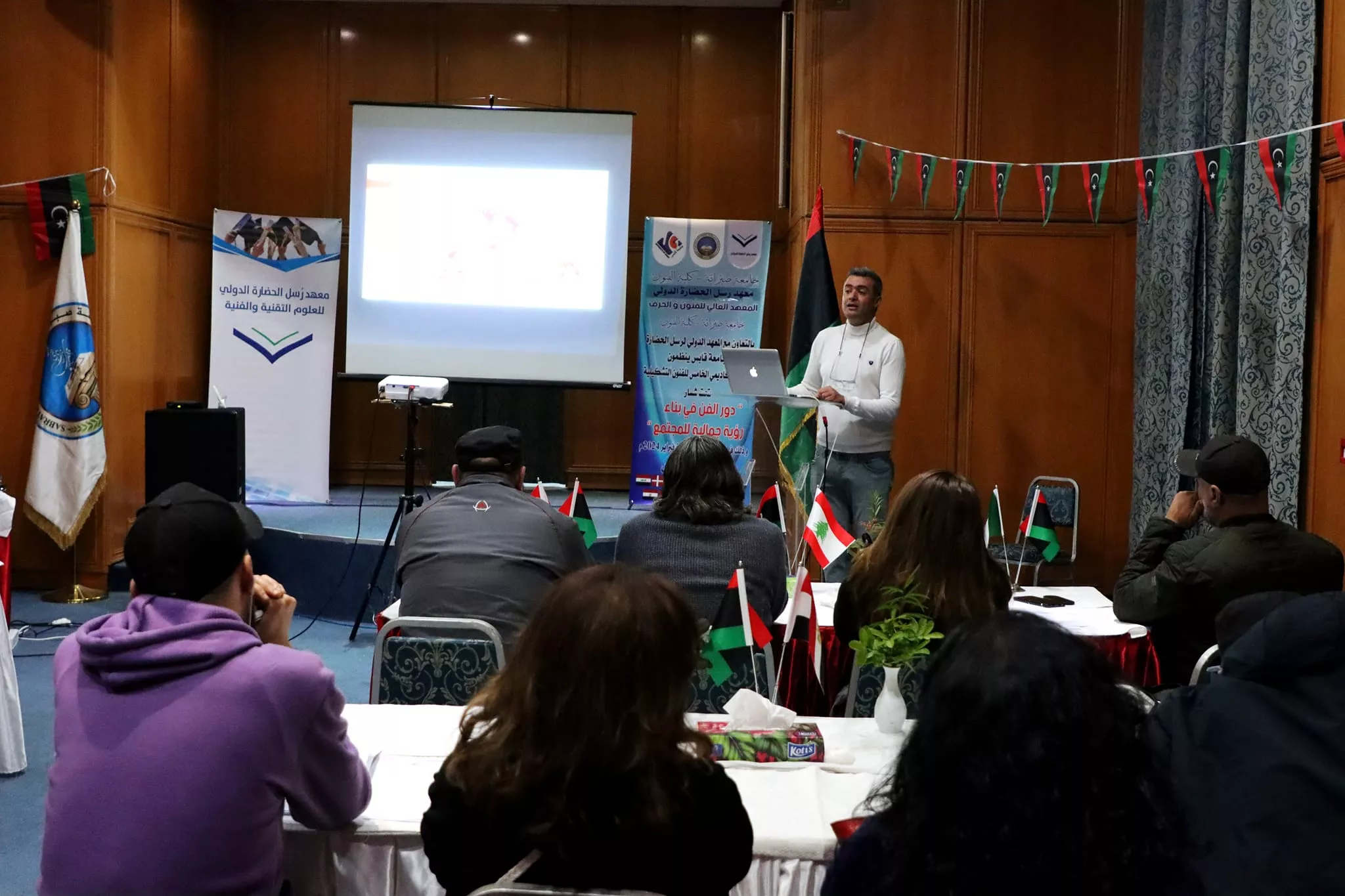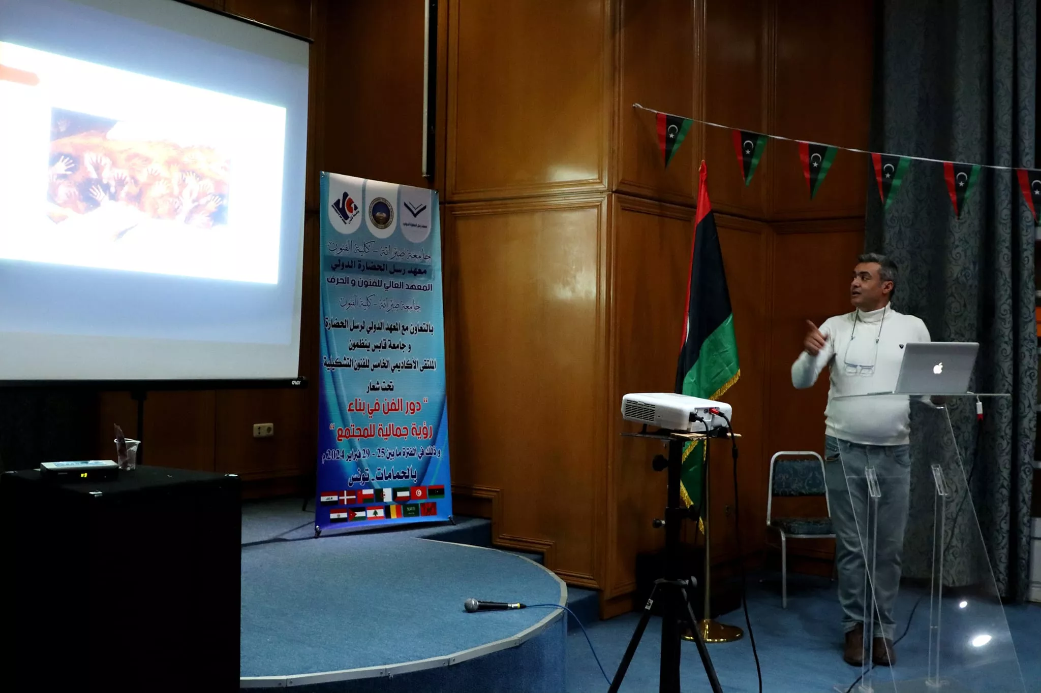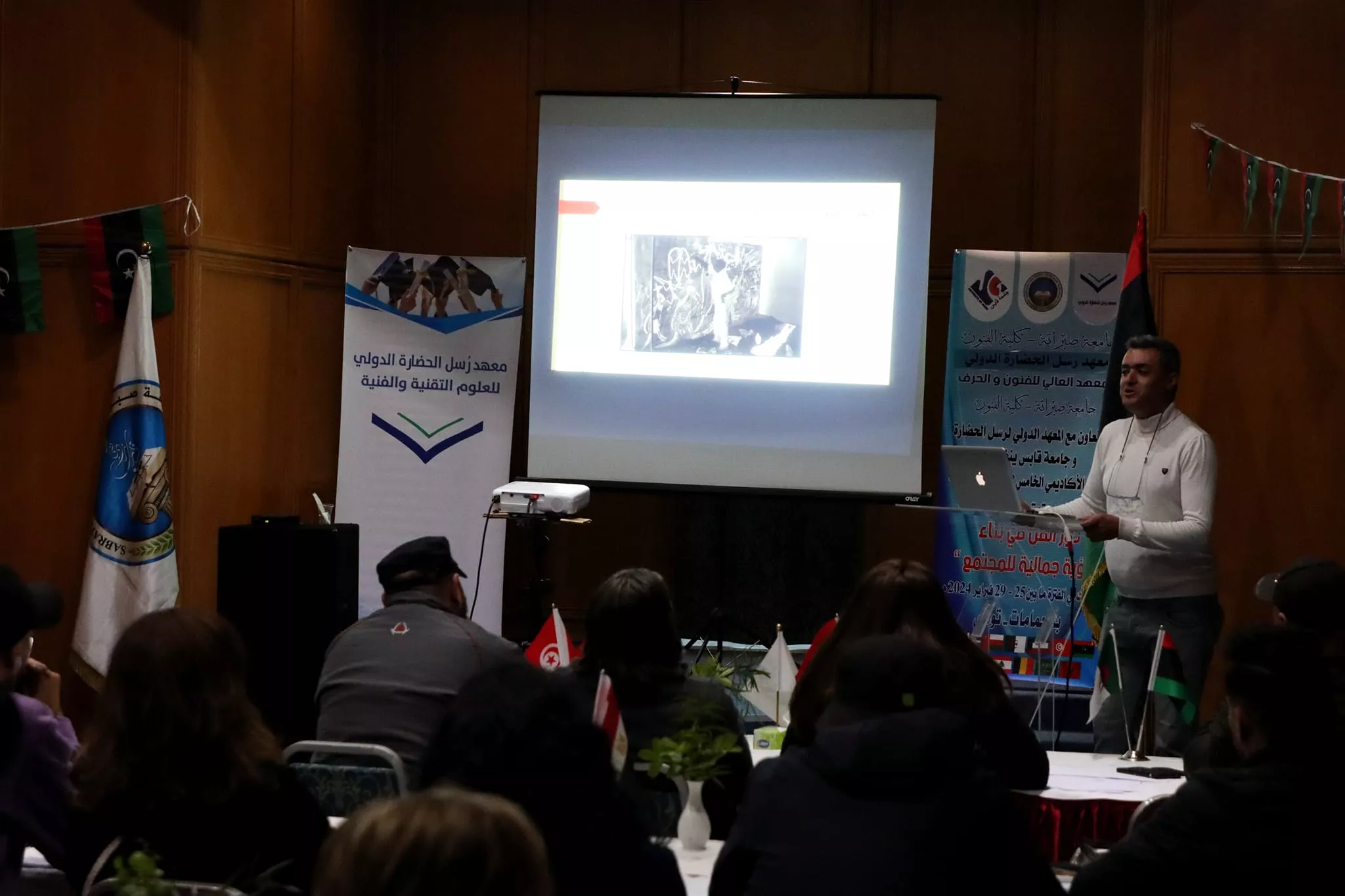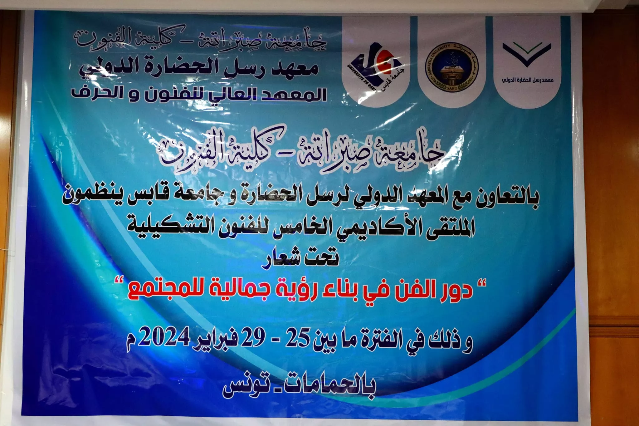 جامعة صبراتة - كلية الفنون المعهد الدولي لرسل الحضارة المعهد العالي للفنون والحرف جامعة صبراتة - كلية الفنون بالتعاون مع المعهد الدولي لرسل الحضارة وجامعة قابس ينظمون الملتقى الأكاديمي الخامس للفنون التشكيلية تحت شعار دور الفن في بناء رؤية جمالية للمجتمع و ذلك في الفترة ما بين 25 - 29 فبراير 2024 م بالحمامات - تونس
