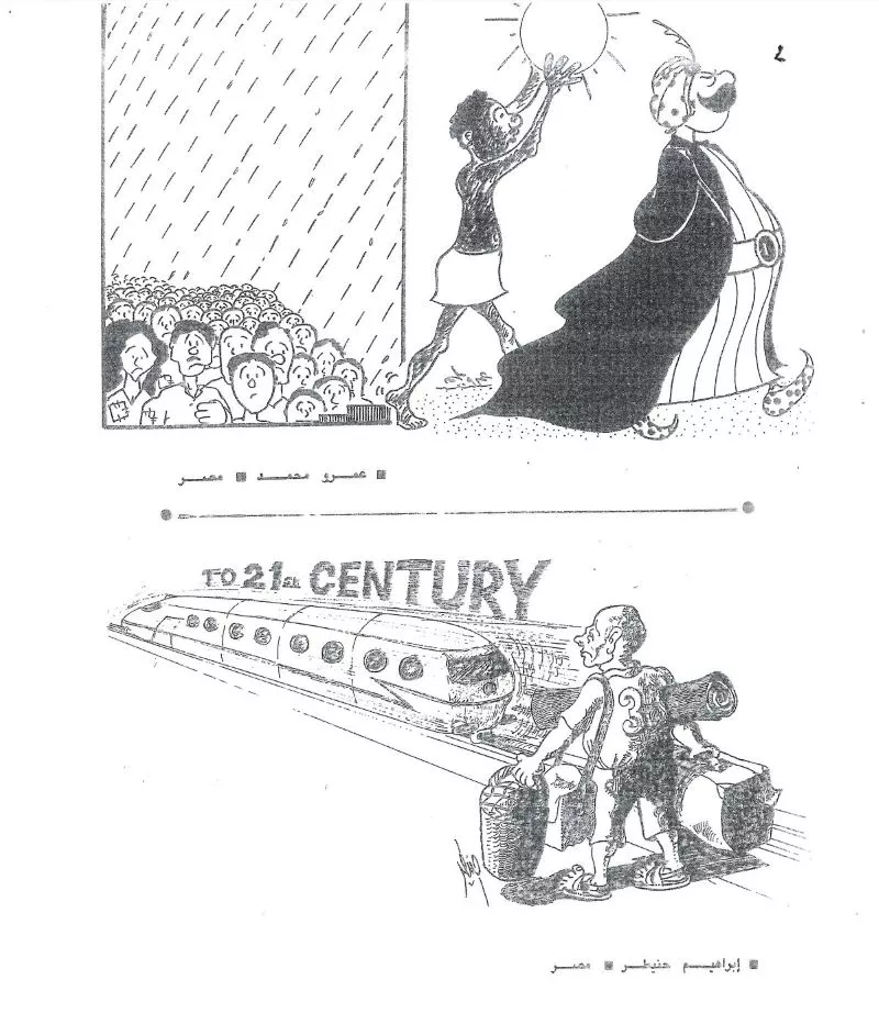هذا المعرض جاء وليد اللقاء بين اتحادى الصحفيين العرب والأفريقيين . وذلك خلال اكتوبر العام الماضى حيث اتفق الاستاذين، صلاح جلال، رئيس اتحاد الصحفيين الأفريقيين و سجاد الغازى، الأمين العام لاتحاد الصحفيين العرب على جعله خاصا بمشاكل الدول النامية. ولهذا جاء اختيارهما للتعبير باسلوب الكاريكاتير اختيار صائبا ، فالكاريكاتير هو فن طرح المشاكل أو الكشف عن خباياها ، أى ابرازها في الضوء تهيئه لمعالجتها. ولهذا ايضا تم اختيار اسم المعرض : العالم الثالث .. وتولت . الجمعية المصرية للكاريكاتير ، دعوة الرسامين للمشاركة باعمالها فيه ، كما تولت خطوات التنفيذ، ابتداء من إجراءات حجز قاعة النيل بارض الجزيرة وتحديد موعد افتتاحه واستمراره ابتداء من أول مارس حتى يوم 15 منه ، وايضا ترتيب خطوات افتتاحه على يدى الاستاذ الدكتور محمود شريف محافظ القاهرة والاستاذ فاروق حسنى، وزير الثقافة وكذلك استقبال الرسوم واعدادها للعرض، وتجهيز هذا الكتيب الذي اشترك في تكاليف اصداره. اتحاد الصحفيين الأفريقيين، واتحاد الصحفيين العرب و « مؤسسة روزاليوسف ، . كما تتولى ( الجمعية المصرية للكاريكاتير : تنسيق الأعمال في قاعة النيل . ومما يستحق الملاحظة، أن الأعمال الكاريكاتيرية التي تؤلف هذا المعرض، في الوقت الذي تعبر عن افكار العديد من البلدان العربية والأفريقية ، فإنها تضع أمام أعيننا أساليب متطورة عديدة من الأداء الكاريكاتيرى . وأبرز ما يميزها هو صدق التعبير وقوة الفكرة، بالاضافة إلى كفاية الوضوح وبساطته. وفي الامكان التعرف على مزاج كل شعب ونوعية تذوقه التشكيلى . ولعل هذا المعرض يصبح دليلا - أيضا - على الدور الذي يلعبه الكاريكاتير في التعبير عن شعوب العالم الثالث ، وليثبت - فى نفس الوقت - أن الديمقراطية في الوقت الذي تساعد على نمو الكاريكاتير وتطوره ، فان الكاريكاتير يدعمها ويعلن على العالم انه ، حيث ينطلق الكاريكاتير تترسخ الديمقراطية