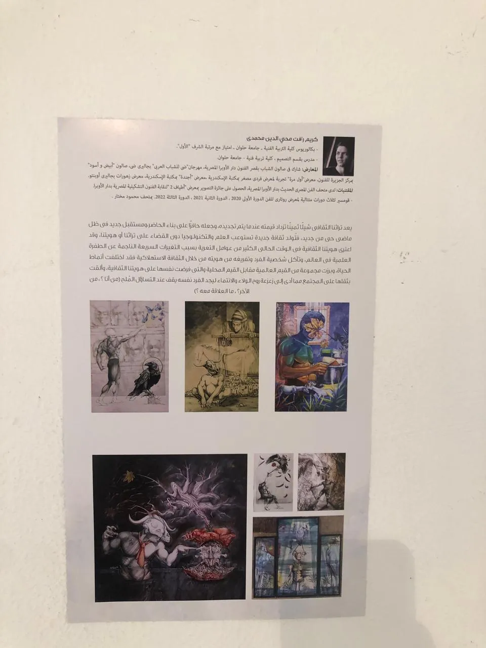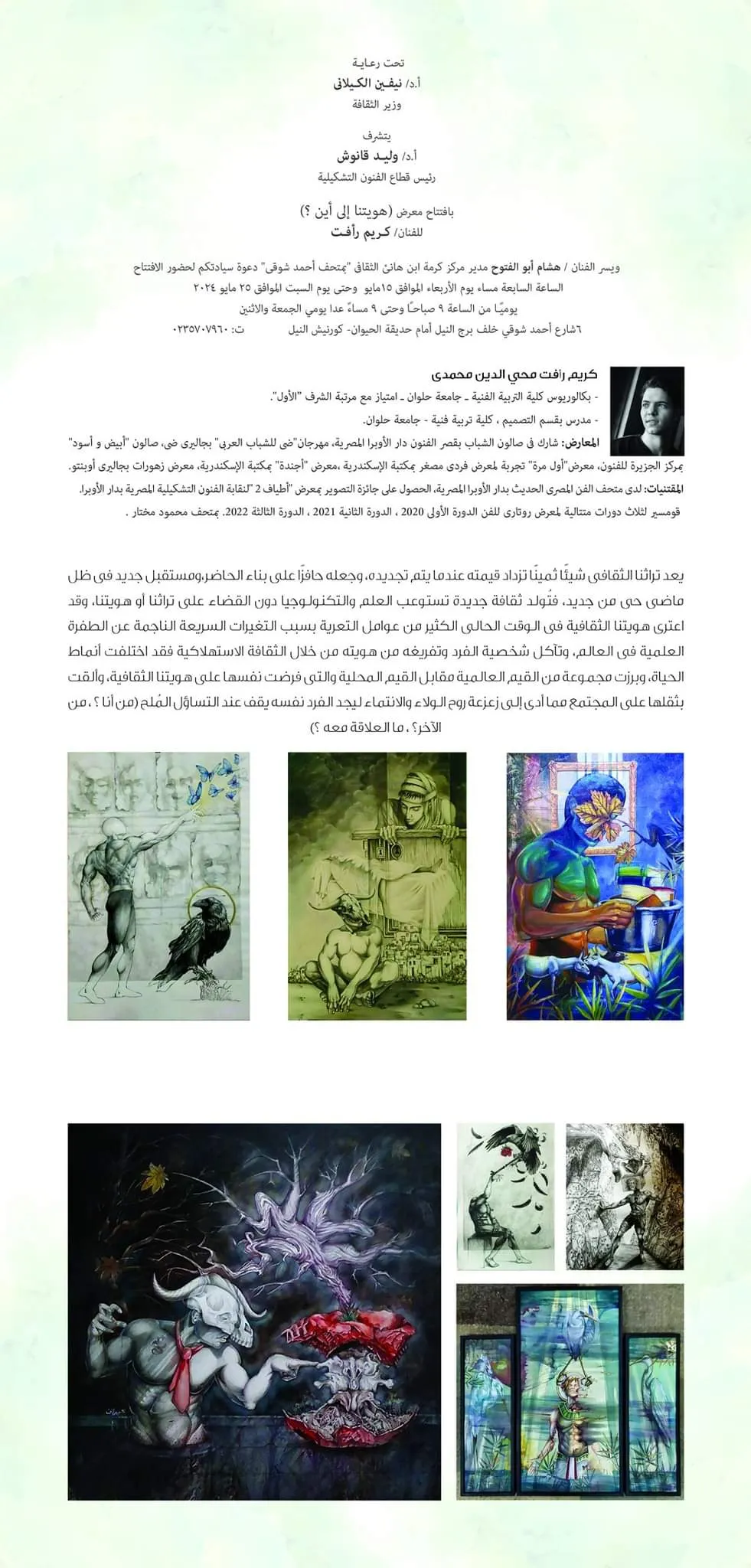 (هويتنا إلى أين؟) بمركز كرمة بن هانئ الثقافي برعاية أ.د/ نيفين الكيلاني وزيرة الثقافة يتفضل أ.د/ وليد قانوش رئيس قطاع الفنون التشكيلية بافتتاح معرض الفنان/ كريم رأفت تحت عنوان (هويتنا إلى أين؟) وذلك في تمام الساعة الـ 7 من مساء يوم الاربعاء الموافق 15 مايو 2024 بمركز كرمة بن هانئ الثقافي بمتحف أحمد شوقي. يستمر المعرض حتى 25 مايو 2024. المواعيد: يومياً من الساعة 9 صباحاً : الساعة 9 مساءً عدا يومي الجمعة والاثنين. العنوان: 6 ش أحمد شوقي – خلف برج النيل أمام حديقة الحيوان – كورنيش النيل بالجيزة. ت: 0235707960 في انتظار تشريفكم #قطاع_الفنون_التشكيلية