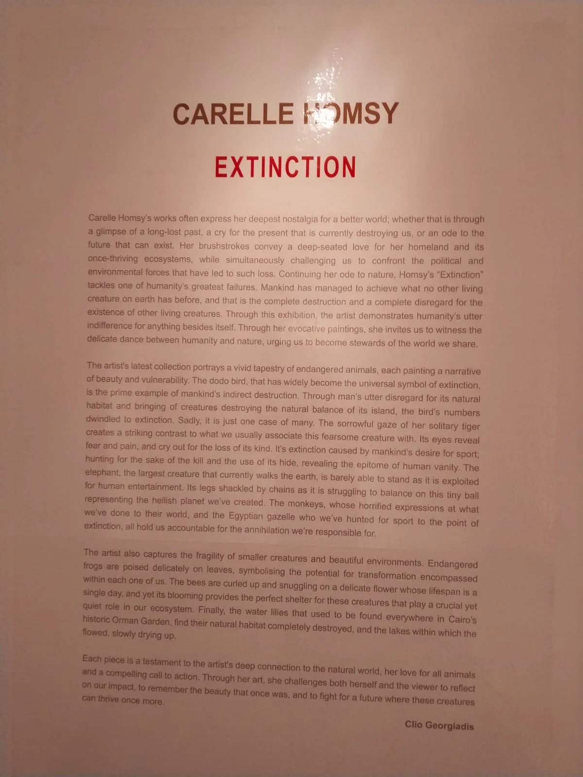 عندما تصمت المخلوقات يتحدث الفن الانقراض من خلال عيون كاريل حمصي — مرآة جمال باهت وعالم زائل. الافتتاح 14 أبريل، الساعة 6 مساءً. المعرض يستمر حتى السابع. من مايو 2025. يومياً من الساعة 11:00 صباحاً حتى 8:00 مساءً باستثناء الجمعة اتصل بنا على +201220771077 +201220770778 +201220770779 11 شارع البرازيل الزمالك، القاهرة، مصر.