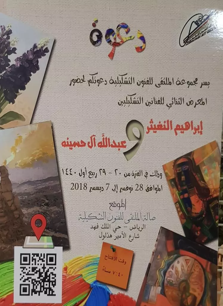 وذلك في الفترة من ٢٠ - ٢٩ ربيع أول ١٤٤٠ الموافق 28 نوفمبر إلى 7 ديسمبر 2018 الموقع صالة الملتقى للفنون التشكيلية الرياض الملك فهد حي شارع ا الأمير هذلول