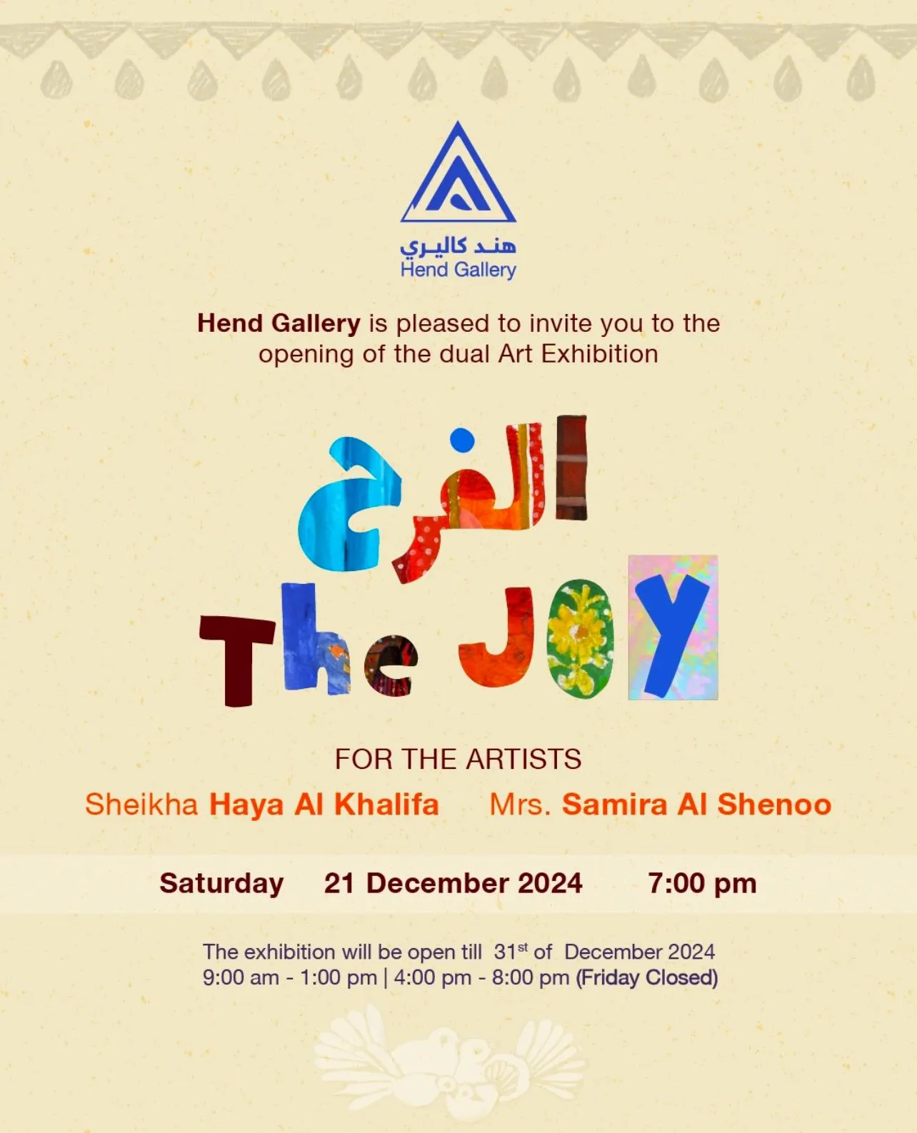 Hend Gallery يسر صالة هند كاليري للفنون دعوتكم لحضور افتتاح المعرض التشكيلي الثنائي الفرح The JOY للفنانتين الشيخة هيا آل خليفة الأستاذة سميرة الشنو يوم السبت 2024 21 ديسمبر 7:00 مساءً يستمر المعرض مفتوحاً لغاية 31 ديسمبر 2024 9:00 ص - 1:00م ثم 4:00 م - 8:00 م الجمعة مغلق