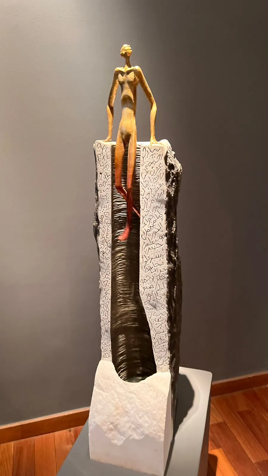 يستعيد فنان النحت المصري ناثان دوس في معرضه "إلى العمق" بجاليري "الزمالك للفن" في القاهرة، ملامح من العصور السحيقة والحضارات القديمة، عبر تماثيل تتبع مسارات ميلاد البشر والجذور الأولى للحياة وما ارتبط بذلك من أساطير كبرى شكّلت وعي الإنسان بشكل مبكر. تتنوع موضوعات المعرض لتشمل صراعات إنسانية أزلية، لا سيما بين الخير والشر، مع مفاهيم الكفاح والبحث عن الحقيقة، وصولاً إلى أثر القوانين والشرائع على النفس البشرية، على نحو بدا معه المعرض وكأنه يعيد صياغة التاريخ الإنساني من خلال "مشاهد يومية" محمّلة بالفلسفة. يضم المعرض أكثر من 20 عملاً، خاض من خلالها الفنان تحديًا مع خامات شديدة الصلابة مثل الكوارتز والديوريت، بالإضافة إلى البرونز، مع رد الاعتبار للمرأة كرمز للخصوبة والولادة في التاريخ القديم. كما نجح في تحدي تحويل الأحجار القاسية إلى رموز ناطقة بالفلسفة، ليمنح منحوتاته بعدًا تاريخيًا وفكريًا يتجاوز مجرد الشكل الجمالي. يضم المعرض مجموعة من التماثيل التي تجمع بين التاريخ والأسطورة بلمسة عصرية ومن أبرزها تمثال للملك أخناتون، الذي قدمه الفنان "ناثان دوس" كتحية لافتتاح المتحف المصري الكبير واحتفاءً بالهوية المصرية. كما يقدّم الفنان معالجة مختلفة لأسطورة "سيزيف" اليونانية الشهيرة التي تركز على فكرة العذاب الأبدي في تدحرج الصخرة التي يصعد بها إلى الجبل ثم تسقط ثم يصعد بها مجددا، في دورة لا تنتهي من المعاناة. ويظهر "سيزيف" في هذا العمل وهو ينجح في تثبيت صخرته فوق الجبل، ممسكًا بهاتفه المحمول ليلتقط صورة "سيلفي" مع إنجازه، في إشارة رمزية لمشاركة الإنجازات التي قد تبدو مستحيلة عبر وسائل التواصل الاجتماعي ZAMALEK ART GALLERY ناثان دوس Nathan Doss إلى العمق Into the e Depth Depth من ۲۹ مارس إلى ١٢ إبريل ٢٠٢٦