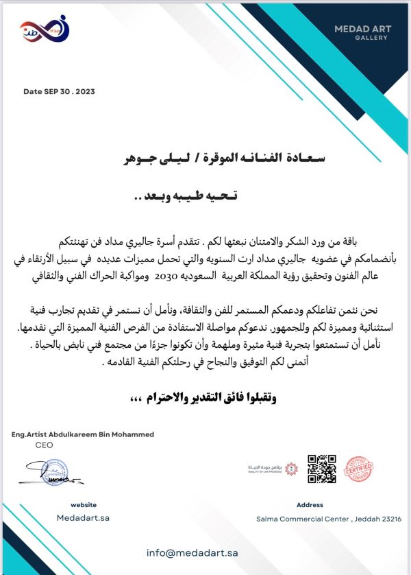 وفي بداية الحوار حدثتنا جوهر عن بدايتها كفنانة تشكيلية، فقالت بأن انطلاقتها كفنانة تشكيلية جاءت من خلال عضويتها في بيت الفنانين التشكيليين في عام 2000، ولفتت بأنها كانت محظوظة حيث وجدت كل ما تطمح إليه من خلال الإنخراط وسط كوكبة رائعة من المبدعين من الفنانين والفنانات أعضاء بيت الفنانين التشكيليين، وإدارته حينذاك برئاسة الفنان القدير هشام بنجابي، ونائبه الفنان عبدالله النواوي، وأنها كانت تمارس الرسم قبل قبل انضمامها للبيت كهاوية ومحبة للفن، وأنها لاحظت وقتها الإعجاب بأعمالها التشكيلية، وطلب إقتناء لوحاتها من المحيطين بها، فكان قرارها بالسعي لصقل قدراتها وأدواتها الفنية. ليلي جوهر أشارت إلى أنها شاركت في دورات وورش عمل جماعية، في كل من الولايات المتحدة الأميركية، والمملكة العربية السعودية، بجانب حرصها علي حضور الأمسىات التثقيفية، وخاصة تلك التي كانت تقام في دارة الفنانة التشكيلية القديرة صفية بنت زقر، والمركز السعودي للفنون التشكيلية الذي كانت تشرف عليه القديرة منى القصبي. وبأنها درست مباديء وأسس الرسم وتقنية اللون، وأسس البورتريه بتقنية الزيت، وشاركت بدورات في فن الباستيل، بجانب المشاركة في المعارض التشكيلية الجماعية، وبالفاعليات والاحتفالات الوطنية، مثل معارض وزارة الثقافة والإعلام، ووكالة الشؤون الثقافية في الرياض، وكان أول حضور فني لها هو المشاركة بالمعرض التاسع عشر للفن السعودي المعاصر عام 2006، ومعارض المقتنيات ومعارض الفنانات التشكيليات السعوديات، وأيضا المشاركة من خلال الجمعية العربية السعودية للثقافة والفنون جدة والرياض وأغلب معارضها محليا ودوليا. وأنه خلال تلك الفترة من التدريب والمشاركة، وبالبحث والتجريب، تمكنت من الوصول لأسلوبها الفني الخاص، وأقامت معرضها الشخصي الأول تحت مسمى "الإنسان والطبيعة" وقدمت من خلاله خلاصة تجاربها مع اللون عبر استخدام الزيت والاكليريك. وتابعت الفنانة ليلي جوهر بقولها: بأن الاحتكاك عبر الورش والفعاليات المختلفة، مع مجموعة كبيرة من الفنانين بالمملكة، ومن داخل مدينة جدة، ومن مختلف المناطق في وطنها المملكة العربية السعودية، بينهم شخصيات فنية رائدة، ساهمت في تغذيتها بصريا وتعزيز هويتها الفنية، والارتقاء بفكرها وتسهيل إيصال رسالتها الجمالية والإنسانية للمتلقي. دلالات ورموز وأضافت جوهر قائلة: إن الهاجس المصاحب لها دوماً في كل أعمالها هو الإنسان في دلالات ورموز وتعابير مجردا من الشكل ومنصهرا مع الطبيعة لتأثيرها على سلوكنا كبشر، وفي تناغم لوني تجريدي بعناصره الغنية. وأنها أنجزت أعمالها في تسلسل لوني بقيم متناغمة وثراء فني، ومن خلال ذلك صارت لها توجهات فنية خاصة، وفلسفة أقامت من خلالها معارضها الشخصي ووجل نتاجها الفني. ولفتت الفنانة ليلي جوهر، إلي أنه في بداية ممارستها الفنية تعاملت مع الأسود والأحمر، ومن ثم تدرجت في سلم الألوان، وحازت لوحاتها في بداية مسيرتها الفنية، على مراكز متقدمة لعامين متتاليين، ونالت من خلالها جوائز ودروعا في أتيليه جدة للفنون لمديره هشام قنديل، ومن الرائد الدكتور الراحل عبدالحليم رضوي، والفنان القدير طه الصبان في معرض الواعدات في دورتيه السادسة والسابعة. ورأت الفنانة والكاتبة ليلي جوهر بأنه "من الطبيعي أن يتنقل الرسام المبتدئ والهاوي عند بدء ممارسته الرسم بين عدة مدارس إلى أن يصل بعد تجارب ومراحل في اتجاه مستقل به يجد ذاته كفنان، فيطور من أدواته ويعزز من أسلوبه إلى أن يتمكن منه ويصير له بصمة في عالم الفنون، وهنا نستطيع أن نطلق على نتاجه إبداعا وليس رسما، وهكذا كانت بدايتها، غير أن اللون وعناصره وتقنيته كانت محور إهتمامها". وتقول جوهر: بأنه بجانب حرصها علي التطوير المستمر لأدواتها الفنية، كانت تحرص على دراسة النقد والتغذية البصرية .. ". فوجدت نفسها متذوقة للأعمال بدرجة تطغي على عطائها كفنانة، وأنها تستمتع كثيراً بالوقوف أمام مغريات اللوحات التشكيلية المعروضة للفناني