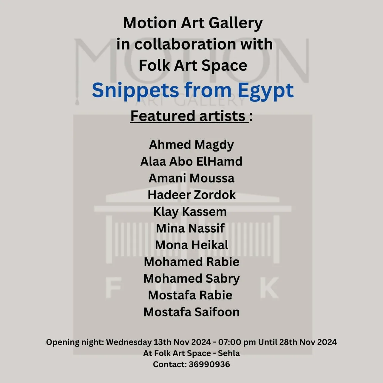 Until November 28, 2024 Folk Art Space - Al-Sahla Artists @alaa_abuelhamd @klaykasem @mohamed.sabry.art @mg_zzzzz @mona.heikal @mrabie402 @mostafasaifoon @mostafa.rabe342 @minanassef1 @amani.mousa @haderzordok