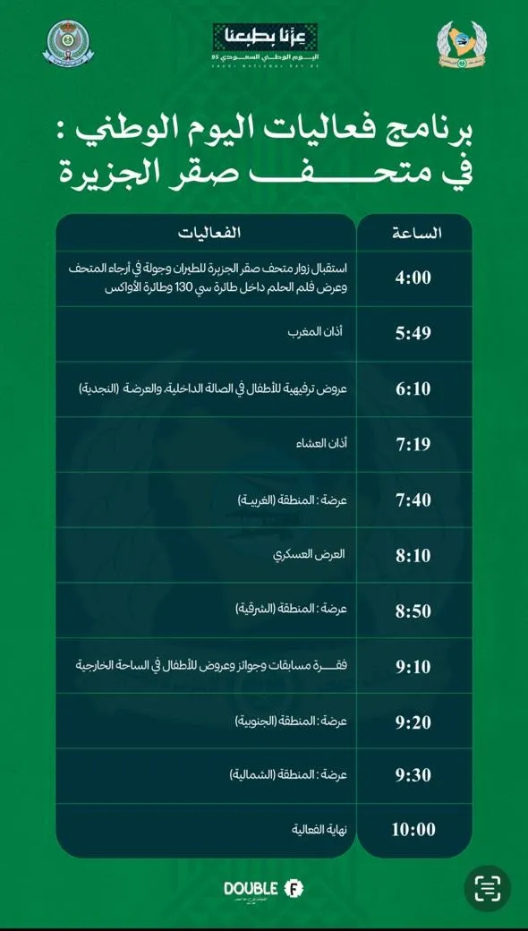 National Day Activities Program: At the Saqr Aljazeera Aviation Museum 4:00 PM Events Visitor reception at the Saqr Aljazeera Aviation Museum, a tour of the museum, and a screening of the film "The Dream" inside a C-130 and an AWACS aircraft 5:49 PM Maghrib Adhan 6:10 PM Entertainment shows for children in the indoor hall, and the Najdi Ardah (Ardha) 7:19 PM Isha Adhan 7:40 PM Ardah: The (Arab) Region 8:10 PM Military Parade 8:50 AM Ardah: The (Eastern) Region 9:10 AM Competitions, prizes, and children's shows in the outdoor courtyard 9:20 AM Ardah: The (Southern) Region 9:30 AM Ardah: The (Northern) Region 10:00 AM End of Event