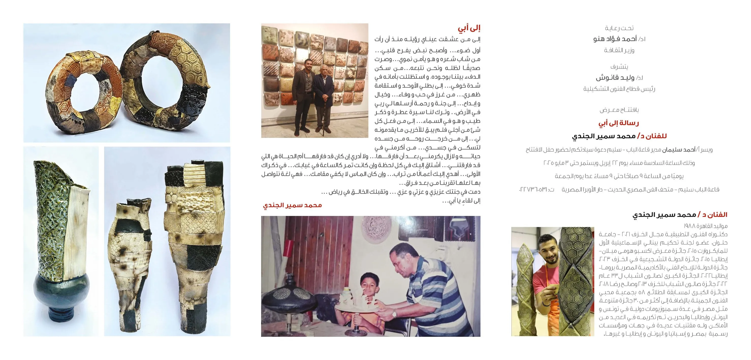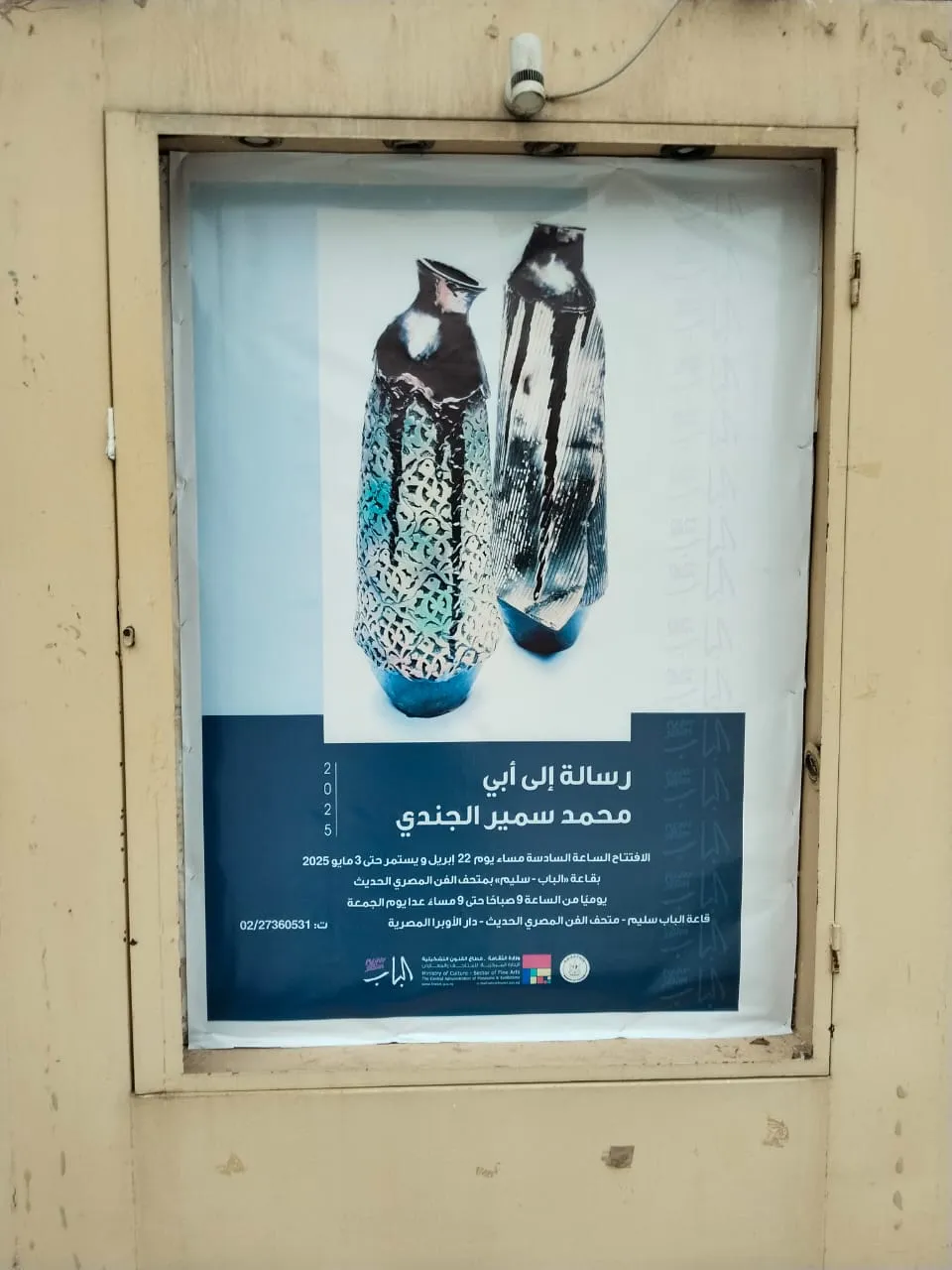 "A Letter to My Father" In the Bab Hall "To the One My Eyes Have Loved to See Since They First Saw the Light" Under the patronage of Prof. Dr. Ahmed Fouad Heno, Minister of Culture, Prof. Dr. Walid Qanoush, Head of the Fine Arts Sector, is honored to inaugurate the exhibition of artist Mohamed Samir El Gendy, entitled "A Letter to My Father." We look forward to welcoming you at 6:00 PM on Tuesday, April 22, 2025, in the Bab Hall, Cairo Opera House. The exhibition will continue until May 3, 2025. We look forward to your presence. Opening Hours: Daily from 9:00 AM to 9:00 PM, except Fridays. Address: Bab Hall - Museum of Modern Egyptian Art, Cairo Opera House. Tel: 0227360531 #Fine_Arts_Sector