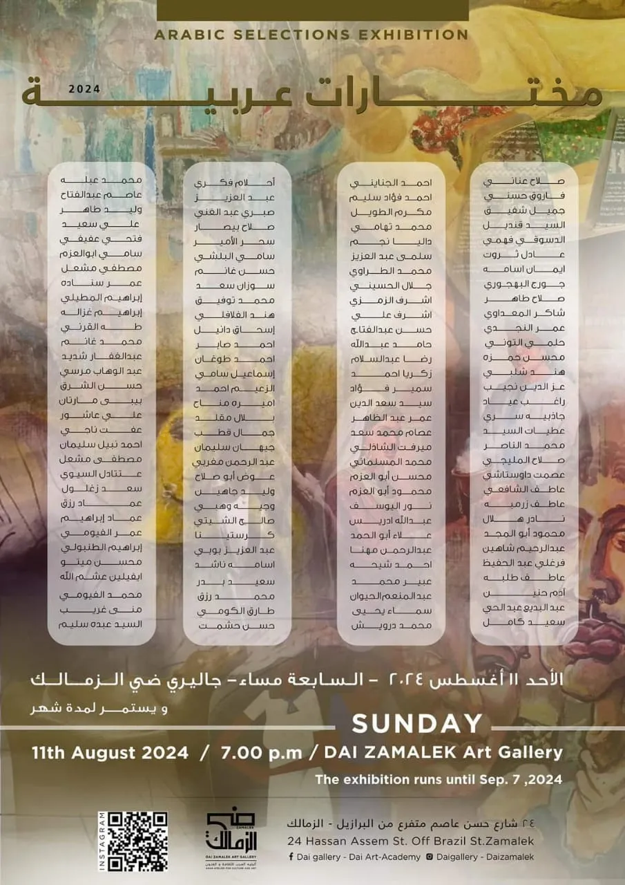 The Arab Atelier for Culture and Arts - Gallery in Zamalek - is honored to invite you to attend the Opening Ceremony of the Exhibition Arab Selections 2024 Sunday, August 11, 2024 - 7:00 PM - Dai Gallery Zamalek And it will continue for a month 24 Hassan Assem Street, branching off from Brazil - Zamalek f Dai gallery - Dai Art-Academy Daigallery-Daizamalek