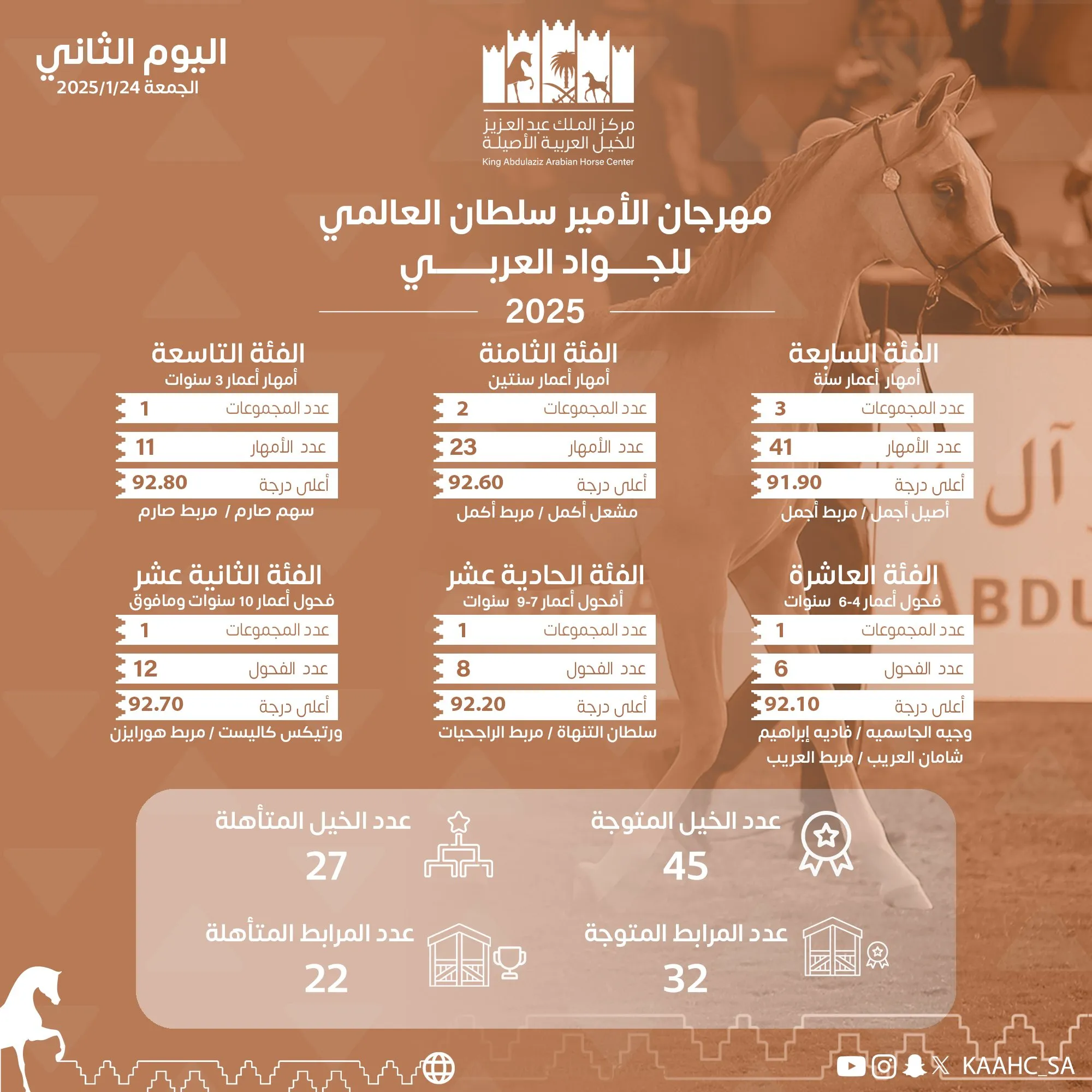 ???? جانب من اليوم الثاني لـ #مهرجان_الأمير_سلطان_العالميوالذي يُختتم غدًا في #مركز_الملك_عبدالعزيز_للخيل ???? pic.twitter.com/Tx3JBImTyV — مركز الملك عبدالعزيز للخيل (@kaahc_sa) January 24, 2025