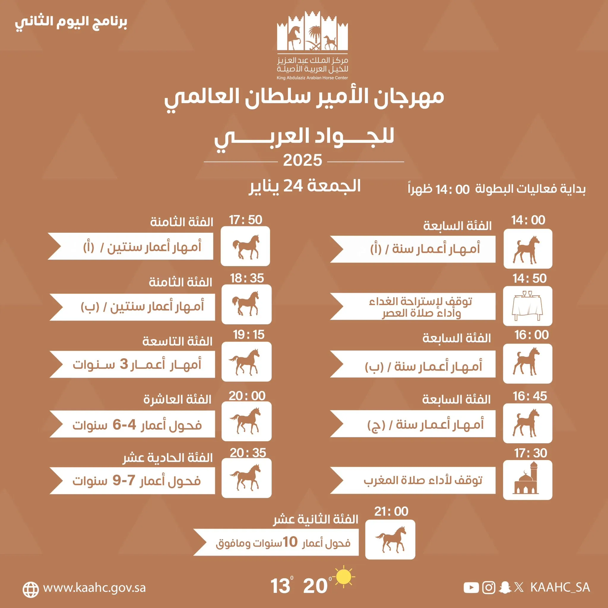 Start of the tournament activities 14:00Friday, January 2414:00Category 7One-year-old Colts / (A)14:50Stop for lunch and Asr prayer16:00Category 7One-year-old Colts / (B)16:45Category 7One-year-old Colts / (C)17:30Stop for Maghrib prayer17:50Category 8Two-year-old Colts / (A)18:35Category 8Two-year-old Colts / (B)19:15Category 93-year-old Colts20:00Category 10Stallions 4-620:35Category 11Stallions 7-921:00Category 12Stallions 10 years and above
