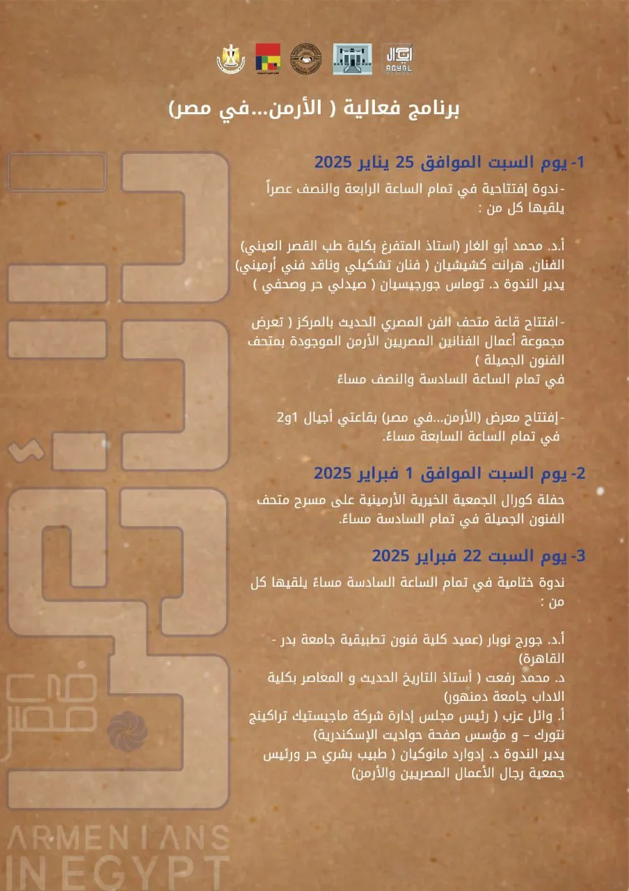 "Armenians in Egypt" Exhibition At the Mahmoud Said Museum Center in Alexandria Armenian artists have a special nature in their relationship with Egypt and the Egyptians, as they were given the opportunity to continue like no other foreign community, and over time they turned into pure Egyptians, distinguished from Egyptians only by their names and Armenian origins, so Egypt became their second home, if not their first. Mahmoud Said Museums Center celebrates a large group of these artists, by displaying works displayed for the first time, some of which date back to the beginning of the twentieth century. The search began with the help of the artist Vahan Talbian, but fate did not give him time to see the fruits of his efforts with us to bring this event to light. We salute Vahan's spirit by displaying a group of his works as the guest of honor of the event, alongside a large group of Armenian artists who lived in Egypt throughout its modern history. We are waiting for you at 4:30 pm on Saturday, January 25, 2025.