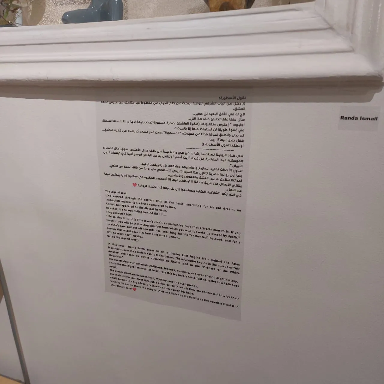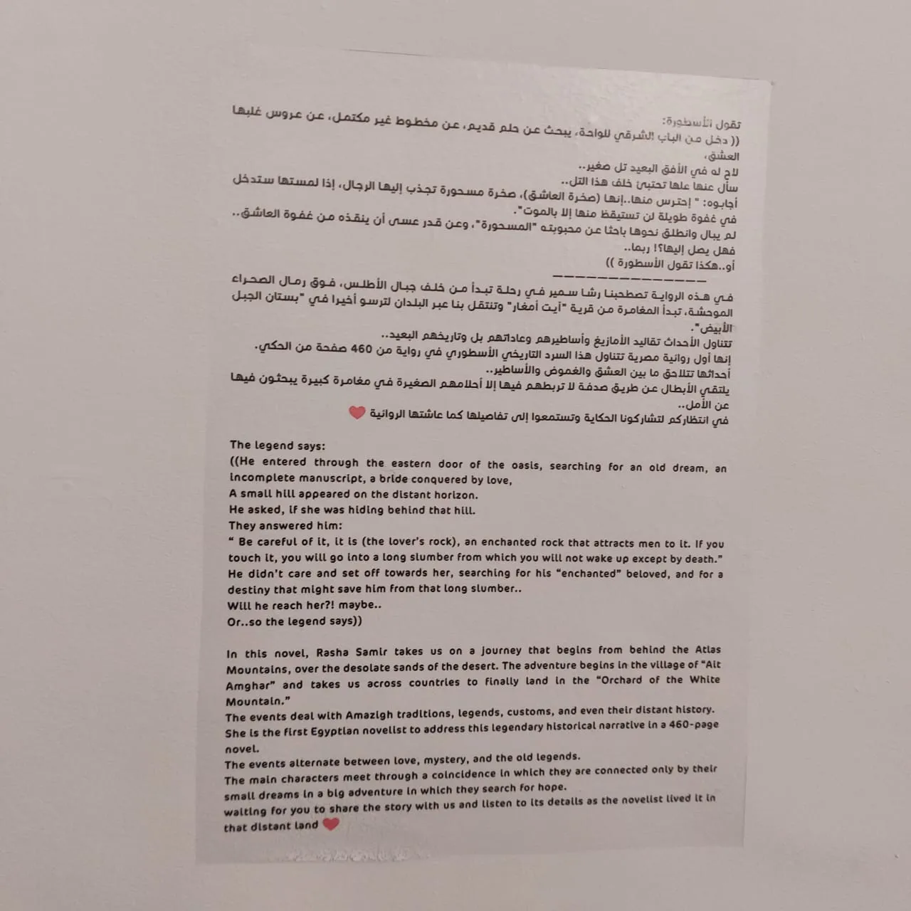 Mark your calendar for an evening not to be missed! The legend says: ((He entered through the eastern gate of the oasis looking for an old dream, an unfinished manuscript, a bride conquered by love. A small hill appeared on the distant horizon. He asked if she was hiding behind that hill. They answered: "Beware of it, it is (the lover's rock) an enchanted rock that attracts men to it. If you touch it, you will fall into a long sleep from which you will not wake up except by death." He did not care and set off towards it in search of his "enchanted" beloved and a destiny that might save him from that long sleep.. Will he reach her?! Maybe.. Or.. so the legend says)) In this novel, Rasha Samir takes us on a journey that begins from behind the Atlas Mountains above the deserted sands of the desert. The adventure begins in the village of "Ait Amghar" and takes us across countries to finally land in the "Garden of the White Mountain"