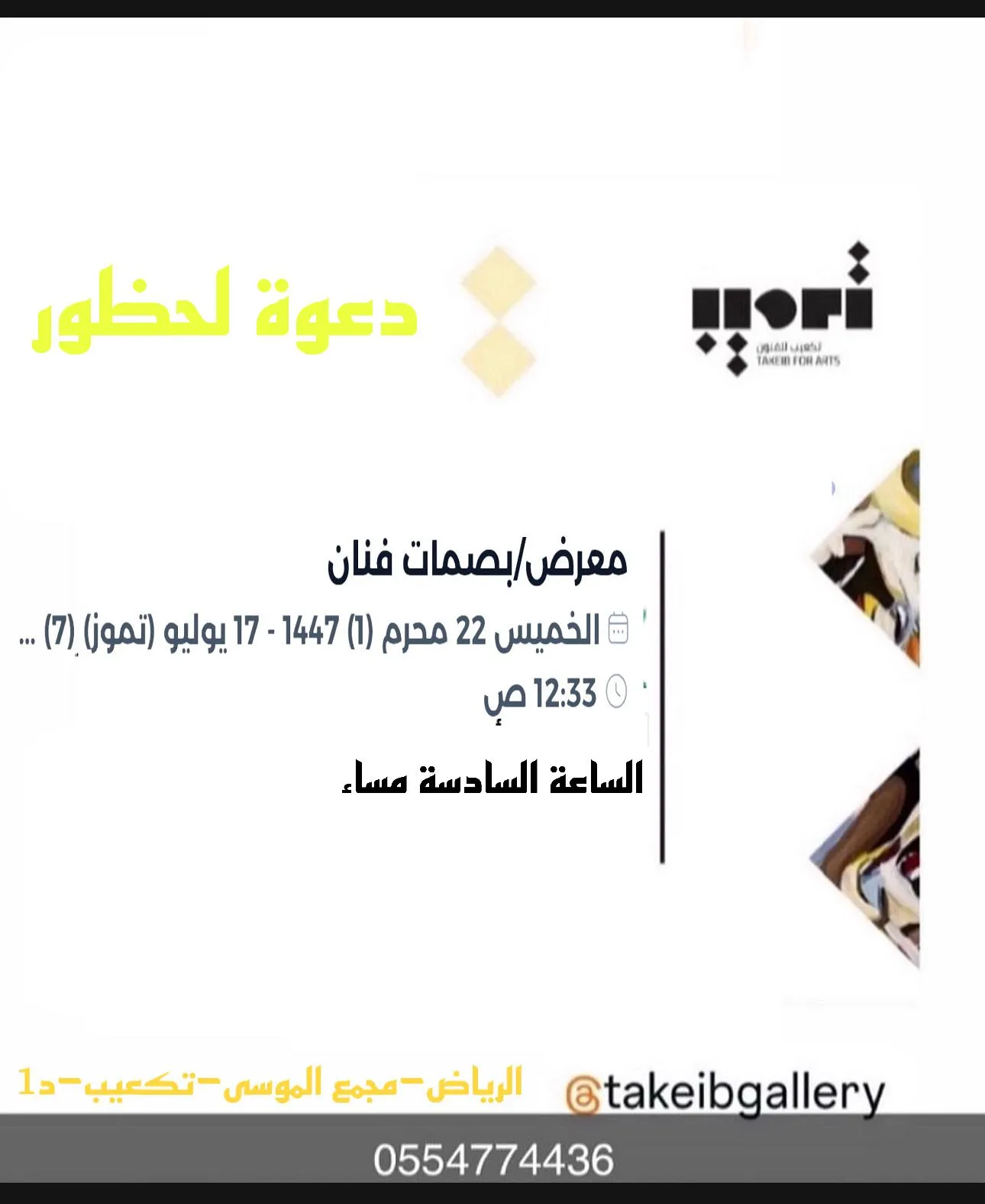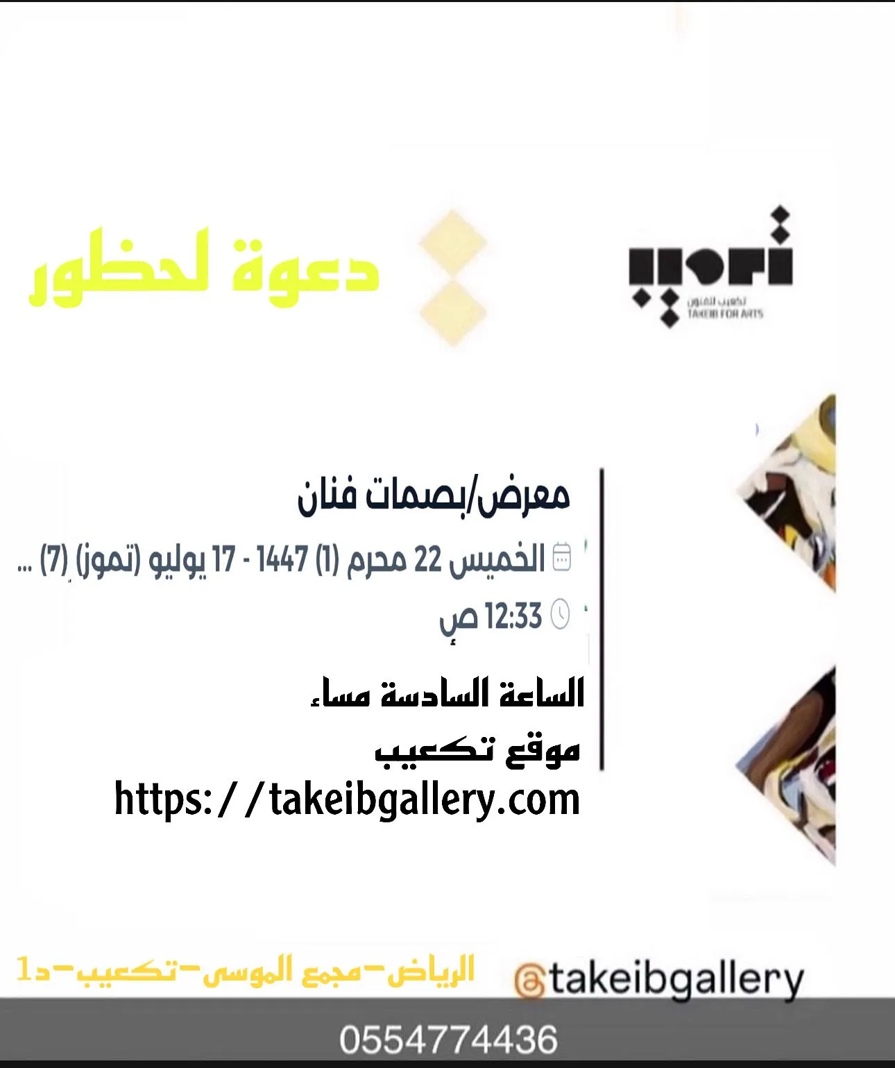 ———————- At the invitation and sponsorship of Tak'ib Art Gallery, the visual artist, founder and director of Tak'ib Art Gallery, Professor Abdullah Al-Tamami, invites media professionals and the public to the opening of the group exhibition (Artist's Fingerprints). The exhibition will open on Thursday evening at 6:00 PM for three days. In his speech, the president and founder of Tak'ib Art Gallery, Professor and visual artist Abdullah Al-Tamami, stated: We are keen to keep pace with aspirations by providing a platform for all types of Arab visual artists to display their artistic production and interact with events, occasions, national celebrations, and other events through the gallery, starting from the capital, Riyadh, and the governorates and regions of Jeddah, Makkah Al-Mukarramah, Madinah, the Southern and Northern Regions, the Eastern Province, and Al-Ahsa. The number of exhibitions held has reached three solo exhibitions and 33 group exhibitions. Among the events taking place this week, starting Thursday, at Tak'ib Art Gallery, is the "Free Studio" event, in which participants will participate. Artists and talents from the Kingdom of Saudi Arabia emphasized our interest in the diverse participation of creative works from diverse schools and orientations, conveying an impression of aesthetic value and visual enrichment to the audience and audience. This encourages the continuity of our activities within a well-thought-out and scheduled mechanism for holding exhibitions befitting the name of art in terms of technique, diversity of styles, and presentation, to showcase the artistic activity of the participating artists in a harmonious manner that highlights the aesthetics of their paintings, thus fulfilling the vision of His Highness the Crown Prince in the field of visual arts. He praised the movement's ability to keep pace with emerging aspirations that align with the visions of the times. He also noted that in the future, training workshops will be held in the Cube Gallery for talented trainees in the foundations and principles of art, as well as other workshops that will vary according to the activities and the artists' needs. These workshops will be conducted by certified male and female artists trained in this field, God willing. Since the gallery's opening, it has witnessed the participation of an elite group of prominent male and female artists who have made their mark, their history, and their contributions to the fine arts scene, alongside emerging young and talented male and female artists. - Attached is a list of the artists participating in the "Ramadan Creativity" exhibition. - Attached is a public invitation from the director of Tak'ib Gallery to attend the exhibition. - Attached are photos of the exhibition and the showroom. Bandar Mohammed. Names of the artists participating in the "Artist's Fingerprints" exhibition. — ...