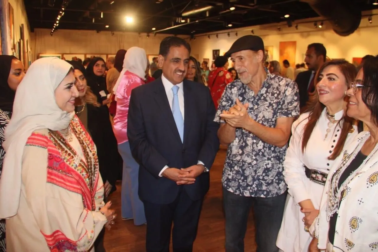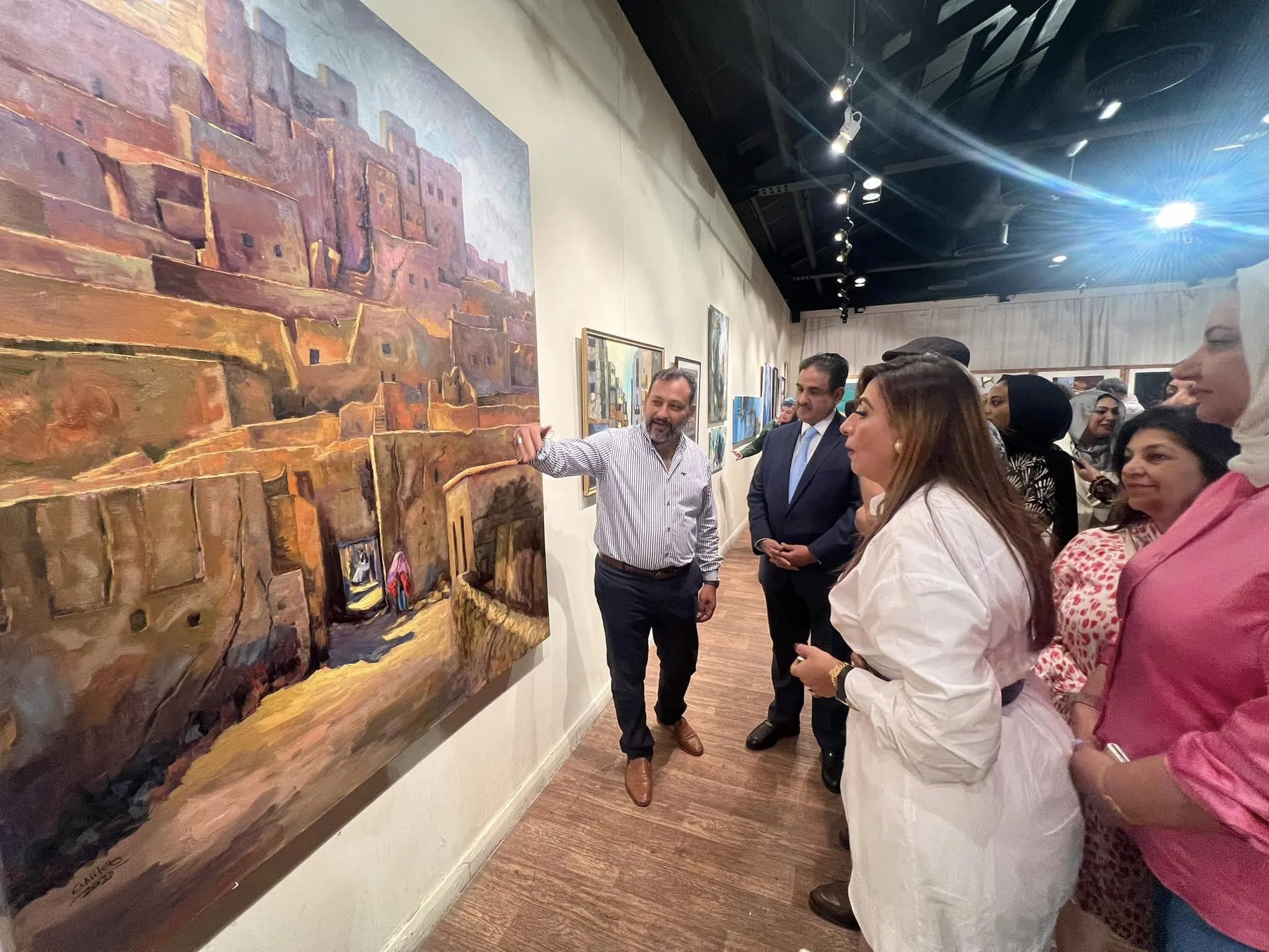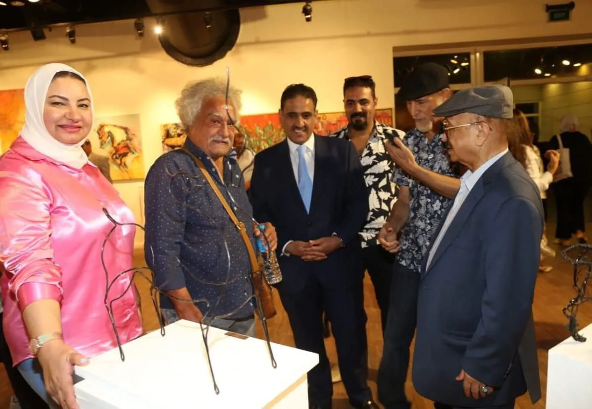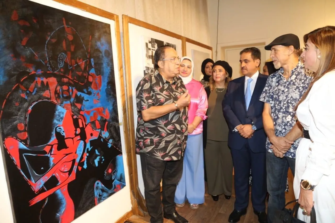 In an atmosphere full of friendliness and art, the head of the Fine Artists Syndicate, artist Tarek El-Komy, inaugurated the art exhibition (Beyond the Frame) at the Egyptian Opera House in the presence of the Deputy Ambassador of the Custodian of the Two Holy Mosques in Cairo, Abdul Rahman bin Salem Al-Dahas, and Manal Metwally, wife of the Egyptian Ambassador to Norway; and the head of the Environment Committee at the Engineers Syndicate, Dr. Naima Al-Qasir, Director of the World Health Organization in Egypt, and a group of public figures and symbols of art and society.