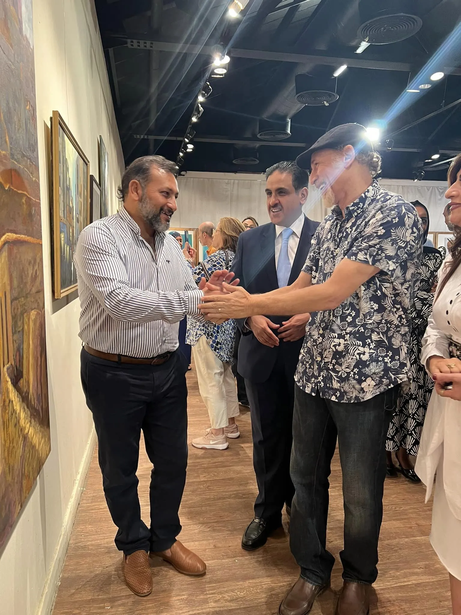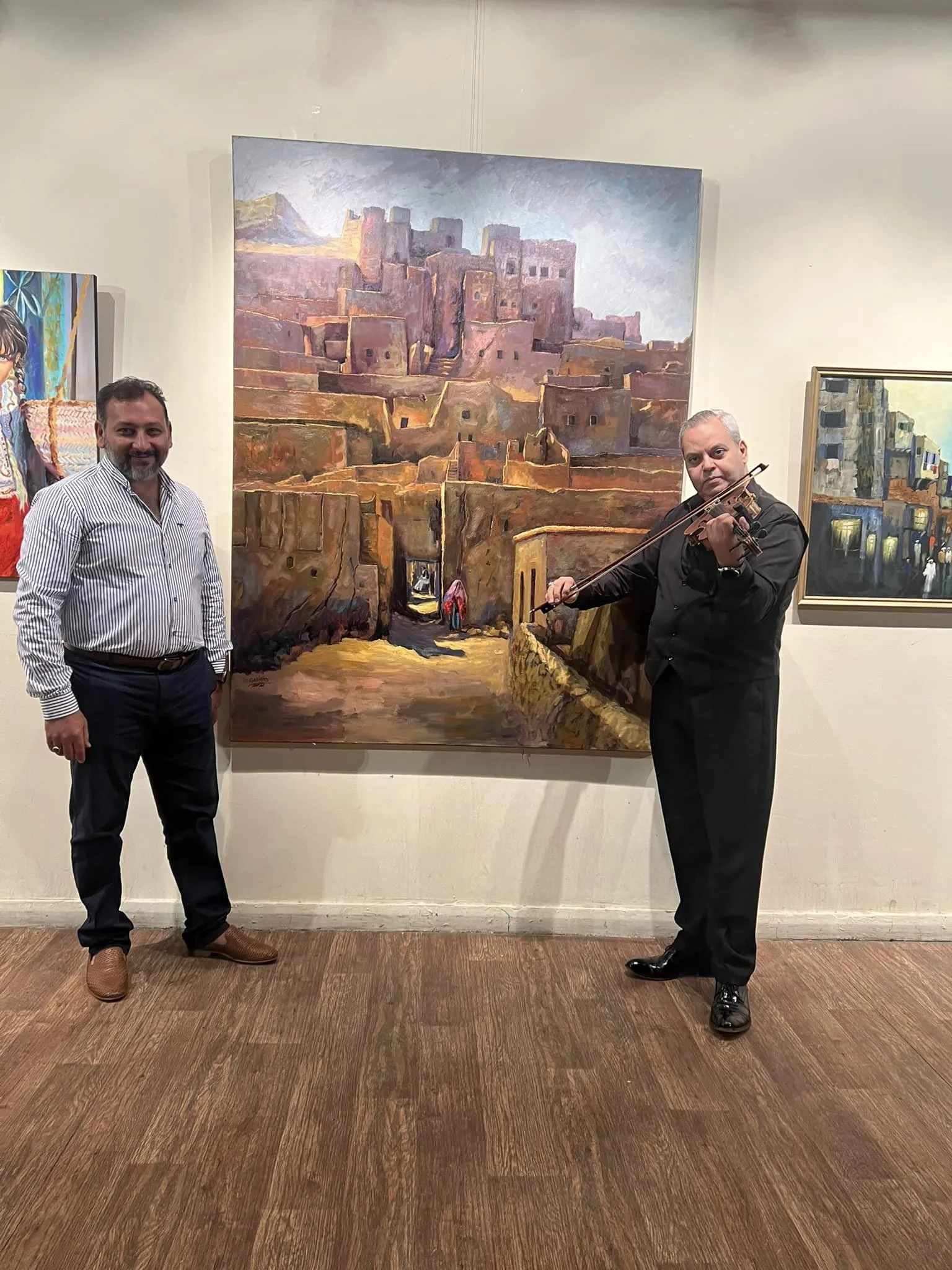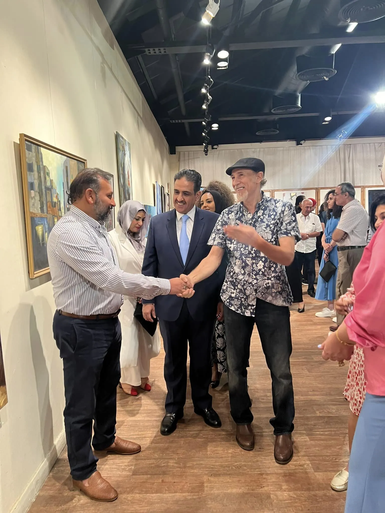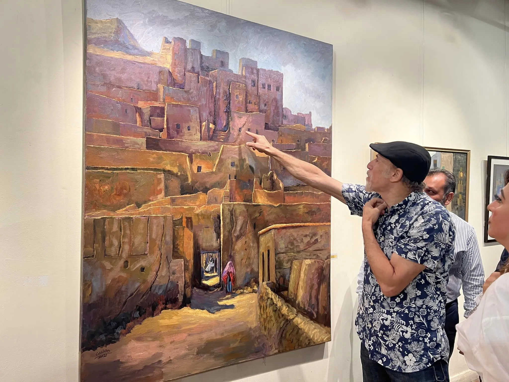 In an atmosphere full of friendliness and art, the head of the Fine Artists Syndicate, artist Tarek El-Komy, inaugurated the art exhibition (Beyond the Frame) at the Egyptian Opera House in the presence of the Deputy Ambassador of the Custodian of the Two Holy Mosques in Cairo, Abdul Rahman bin Salem Al-Dahas, and Manal Metwally, wife of the Egyptian Ambassador to Norway; and the head of the Environment Committee at the Engineers Syndicate, Dr. Naima Al-Qasir, Director of the World Health Organization in Egypt, and a group of public figures and symbols of art and society.
