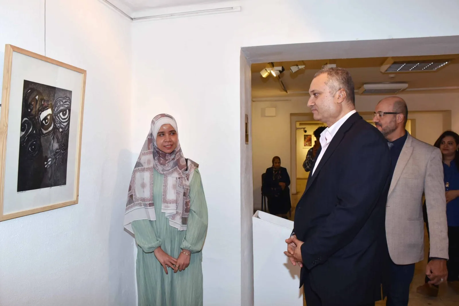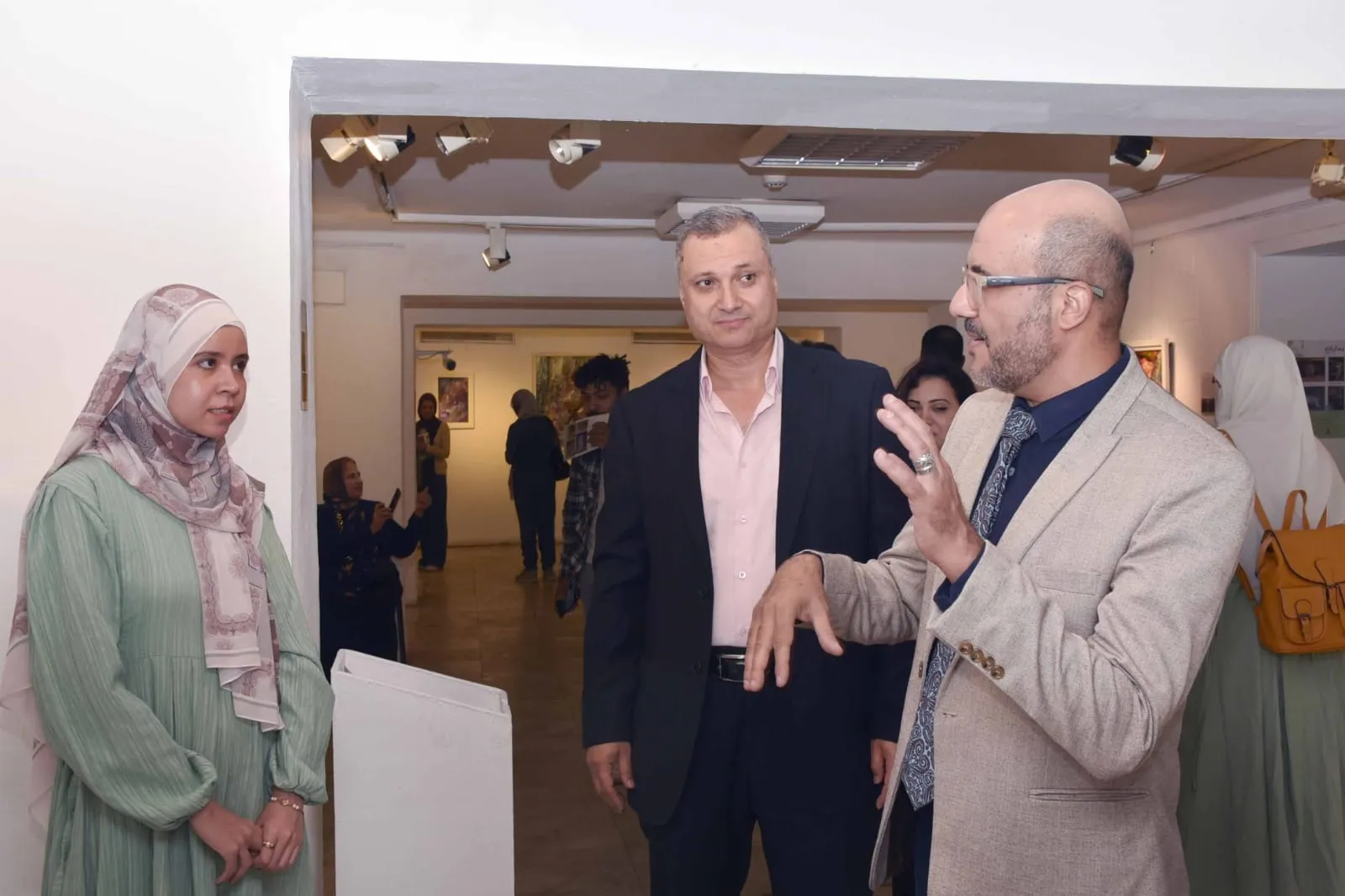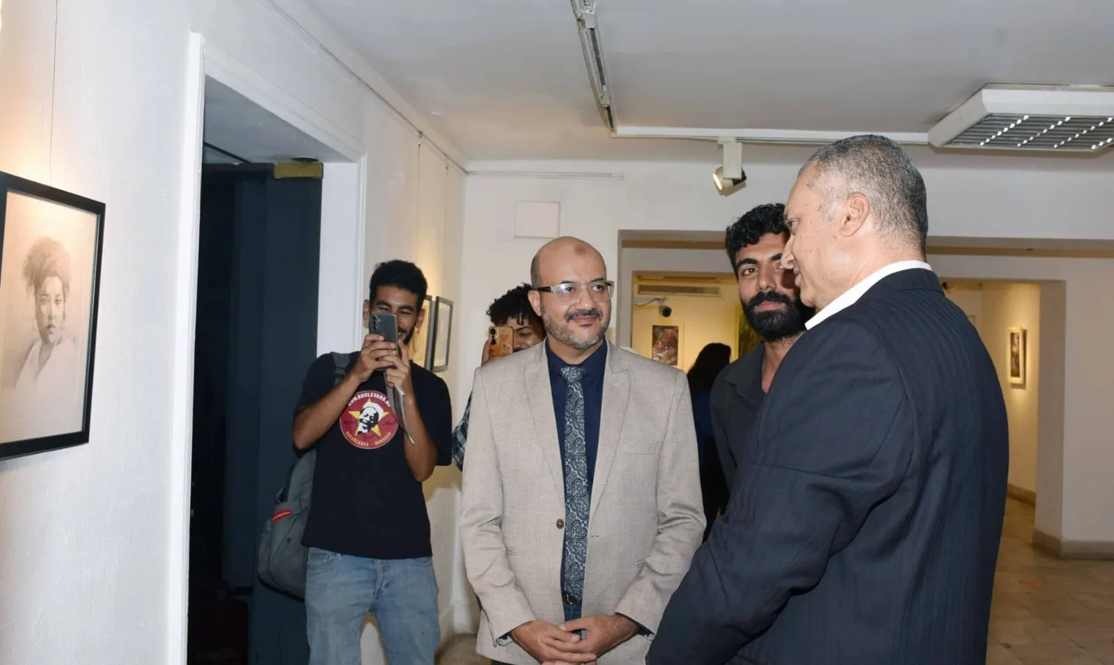 In light of the Fine Arts Sector's celebration of the anniversary of the Prince of Poets Ahmed Shawky, the group exhibition "Beginnings" was opened for female artists (Asmaa Nadi Tawfiq - Israa Mohamed - Suzan Adel Issa) and artist/ Hesham Ali Al-Sayed in the presence of Prof. Dr. Mohamed Hamdy Professor of Photography at the Faculty of Fine Arts - Helwan University and founder of the Drawing Egypt Group, which implemented a drawing and photography workshop after the opening of the exhibition, on Wednesday, October 16, 2024.