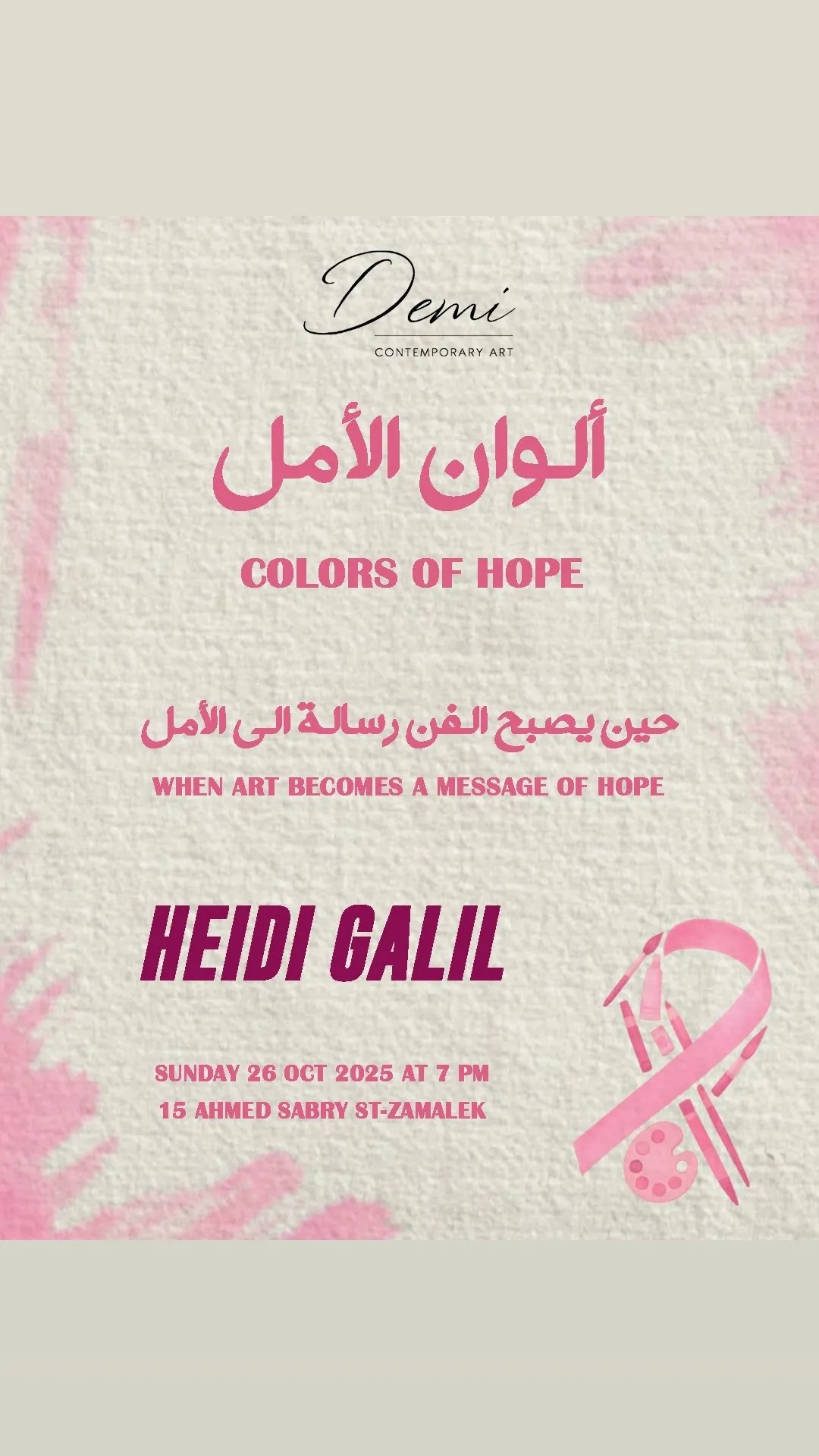 Demi Art Gallery is delighted to invite you to attend the group exhibition “ COLORS OF HOPE “ When Art Becomes A Message Of Hope The gallery will donate 20% of the exhibition’s artwork sales to support the brave ighters of Baheya Hospital. the Group Exhibition by Artists : Angy Elsedawey Dina Barakat Dalia Amer Dalia Hamouda Eman Azzam Heba Badr Heidi Galil Iman Elgammal Laila Spahi Laila Hosny Noha kamal Nahed Shaker Rasha Bseiso Sherine Behairy Shereen Gawad Wafa Nashashibi in venue on th 26 of October 2025 at 7 pm. Waiting for you all. Location: 15 Ahmed sabry st-zamalek Phone: 01205777147 EMail: demiart61@gmail.com