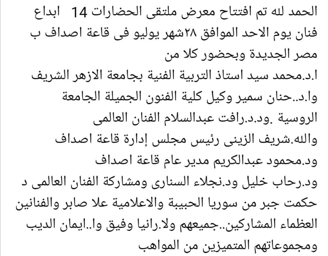 Masoud International Forum for Culture and Arts, Headquarters, Egypt, and Masoud International Academy for Arts and Training are honored to participate in the International Realistic Exhibition of Fine Arts, Artworks, Hand Made, Arabic Calligraphy, Sculpture and Decoupage... in Asdaf Gallery Hall in Heliopolis, Cairo, in Korba Square, on Sunday, July 28, 2024, and the opening will be at 4:00 PM, in the presence of a group of professors from the Faculties of Arts, media professionals and artists. With the compliments of the Chairman of the Board of Directors, Dr. Eng. Abdel Latif Masoud