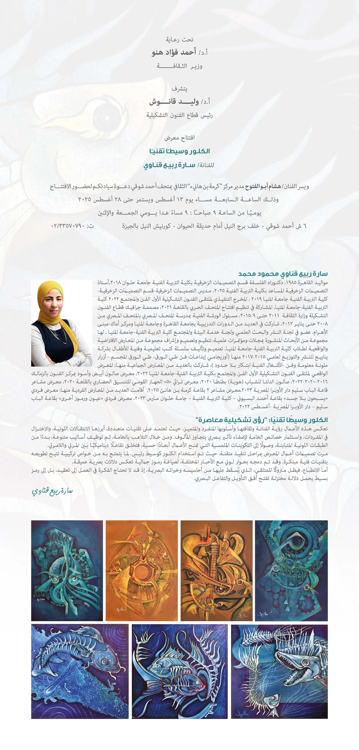The distinguished artist, Prof. Abdel Aziz El Gendy, inaugurated the exhibition of artist Sara Rabie Qanawi, titled "Chlorine as an Artistic Medium," at the Karma Ibn Hani Cultural Center in the Ahmed Shawqi Museum. The exhibition was attended by a large number of "One Shot" artists and visitors to the center, on Wednesday, August 13, 2025. We are pleased to invite you to visit the exhibition and enjoy the artist's distinguished works. #FineArtsSector #ArtExhibitions