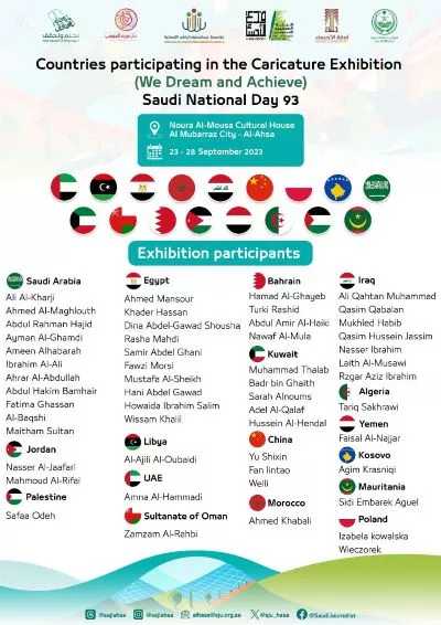 The Secretary of Al-Ahsa, Eng. Essam Al-Mulla, inaugurated the caricature exhibition “We Dream and Achieve” on the occasion of the 93rd Saudi National Day, with the participation of 57 artists from 18 different countries within the activities of Al-Ahsa Governorate. Celebrate in Al-Ahsa