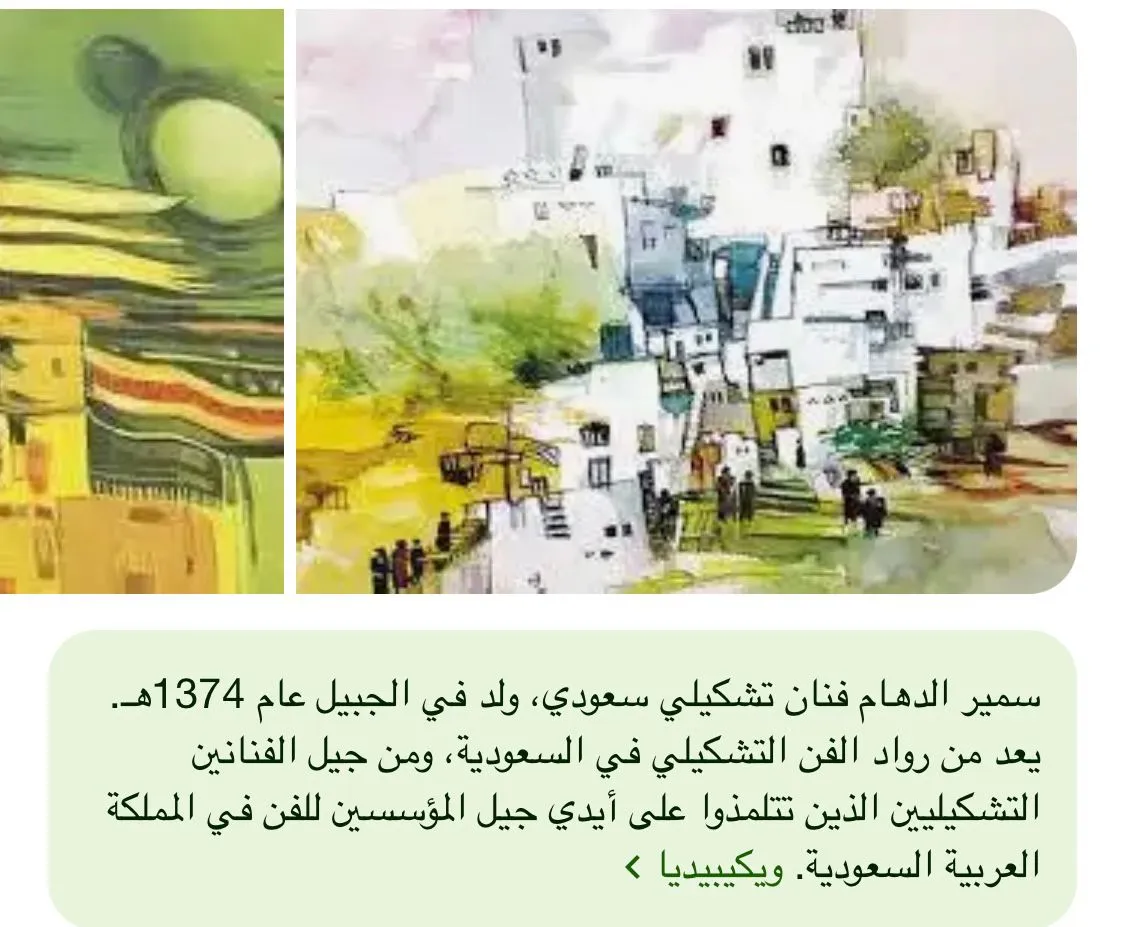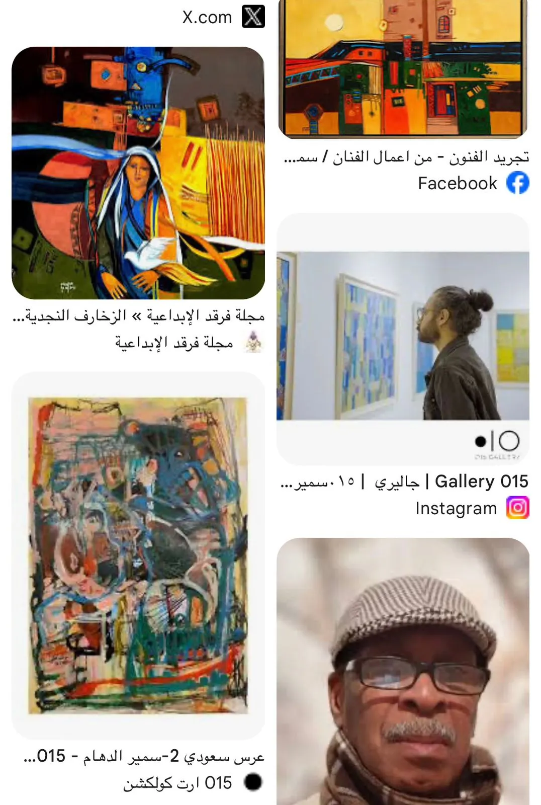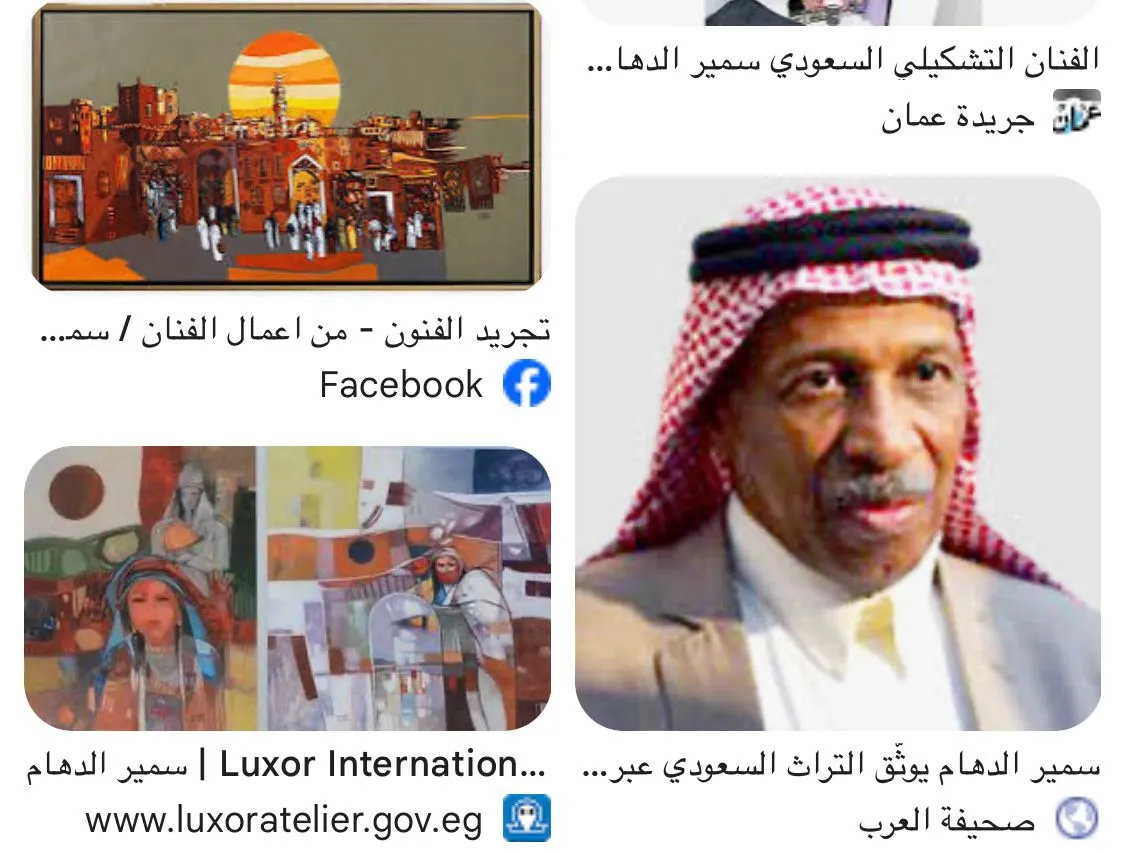 He began his artistic career at an early age, as he was interested in coordinating objects and drawing since his childhood. He received support from his family and teachers, which helped him develop his artistic talent. Al-Dahham worked in journalism as a cartoonist and symbolic artist, and he played a major role in developing the pages of plastic arts in the Saudi press. He also held several positions in the Culture and Arts Association, including Chairman of the Fine Arts Committee and Chairman of the Media and Publishing Committee. He participated in many local and international exhibitions, and played a prominent role in beautifying government buildings in the Kingdom. One of his most prominent works is the painting "Martyr Muhammad Al-Durrah", which was used by the writer Ghazi Al-Gosaibi as the cover for his collection of poems "Ya Fida Nazerik". Samir Al-Dahham is a prominent Saudi visual artist, distinguished by his unique style that combines local and international influences. His works are influenced by the local environment and humanitarian issues, which gives his paintings an emotional and human depth. Analysis and criticism of Samir Al-Dahham's works Environmental influences: Al-Dahham draws inspiration for his paintings from the environment around him, as he reflects in his works the details of daily life and Saudi nature. He uses colors that express the desert, palm trees, and coffee, which gives his paintings a distinctive local character. Artistic techniques: Al-Dahham relies on international techniques to express depth and perspective, which makes his paintings rich in detail and precise in execution. He uses colors with precision and softness, which reflects his high artistic skill. Human topics: Al-Dahham's paintings address humanitarian and social topics, as he expresses feelings of love and belonging to the environment and society. The influence of humanitarian issues and emotional reactions appears in his works, which makes them speak to the viewer on a deep level. Cultural Influences: Al-Dahham reflects the influences of Saudi culture and folklore in his works, giving his paintings a distinctive cultural character. He uses symbols and colors that express Saudi heritage, making his works embody the cultural identity of the Kingdom. Works Reviews Al-Dahham's works are characterized by emotional and technical depth, as he combines local and global influences in a unique way. His paintings reflect feelings of love and belonging to the environment and society, making them speak to the viewer on a deep level. In general, Samir Al-Dahham is considered a creative artist who is distinguished by his unique style and ability to express feelings of love and belonging to the environment and society through his paintings.